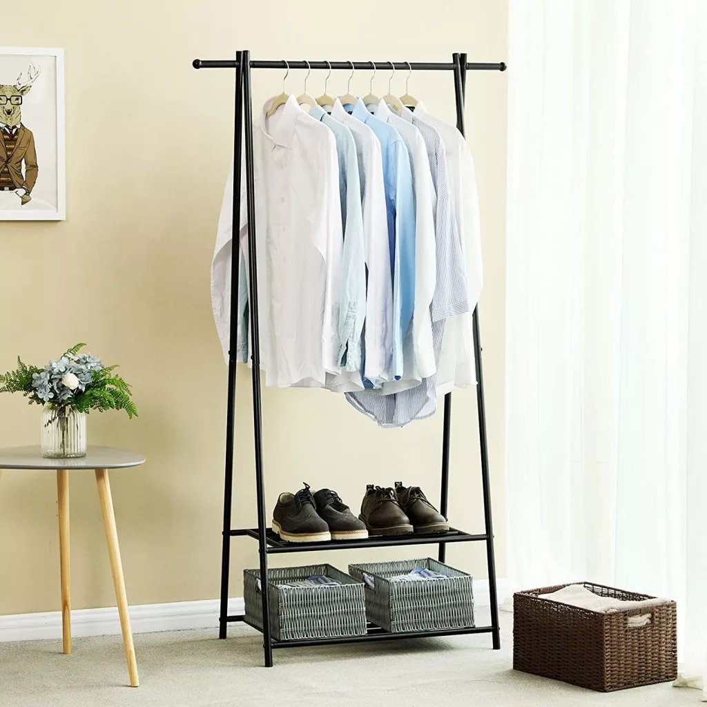 A ruhaállvány felső rúdján kabátok, ingek és egyéb ruhadarabok tárolhatók, míg az alsó polcokon cipők és tárolódobozok kaphatnak helyet. Az állvány kompakt mérete ellenére jelentős tárolókapacitást biztosít, így ideális választás kisebb lakásokba vagy gardróbhelyiségekbe.
