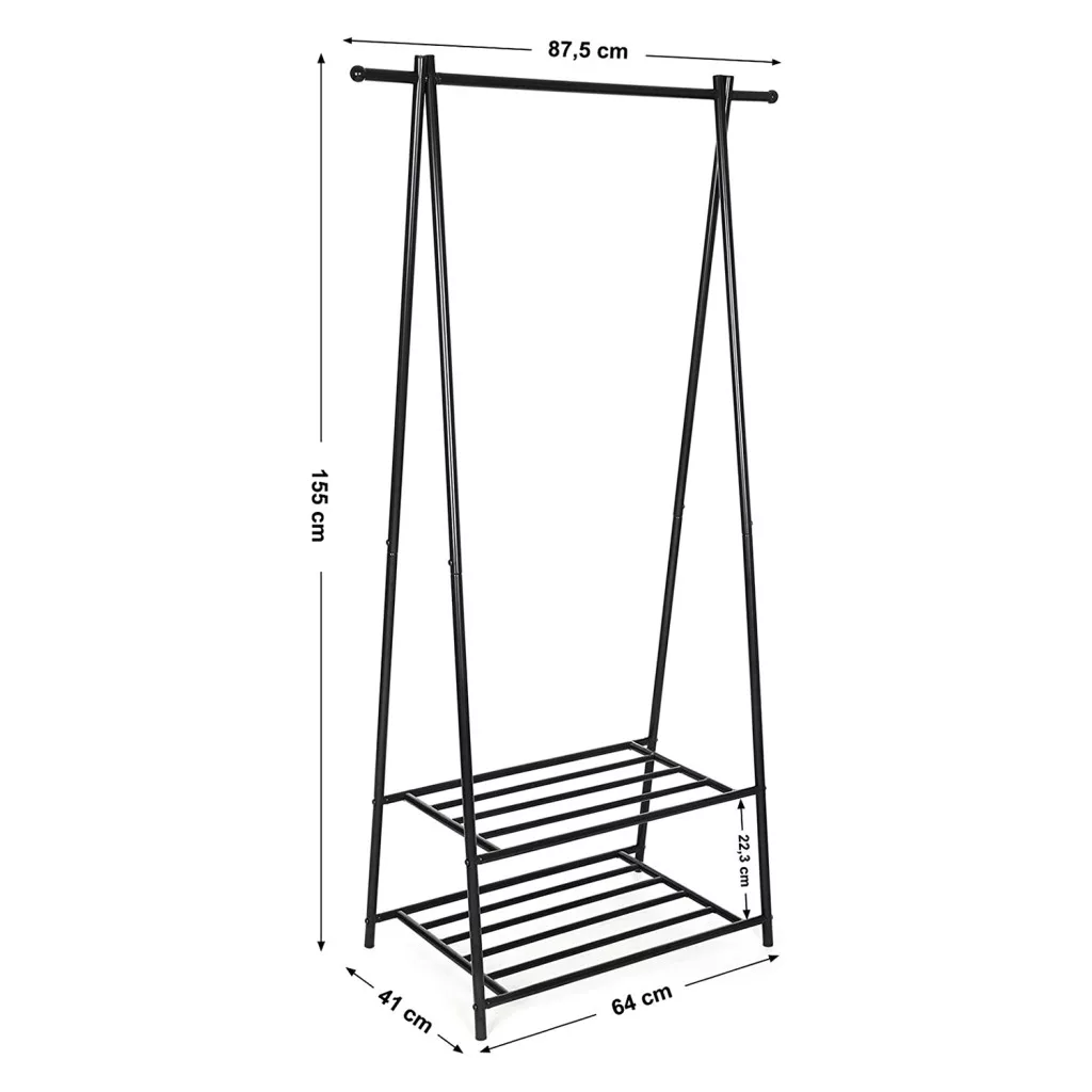Ez az A-alakú, fekete fém ruhaállvány egyesíti a funkcionalitást és az elegáns megjelenést. A stabil vázkonstrukció és a kétszintes tárolópolc rendszer maximális helykihasználást biztosít, miközben a minimalista dizájn tökéletesen illeszkedik bármilyen modern enteriőrbe.