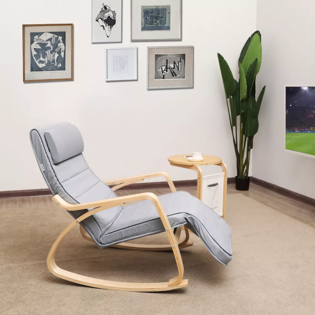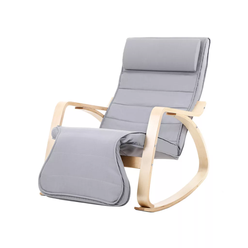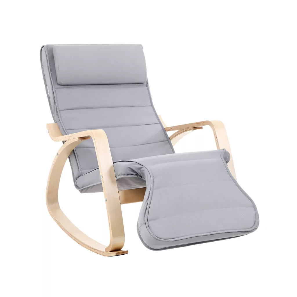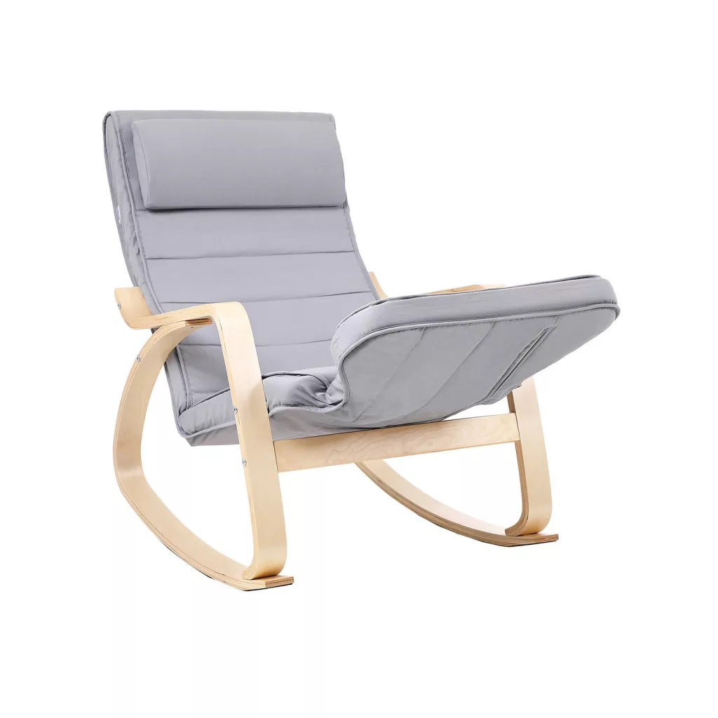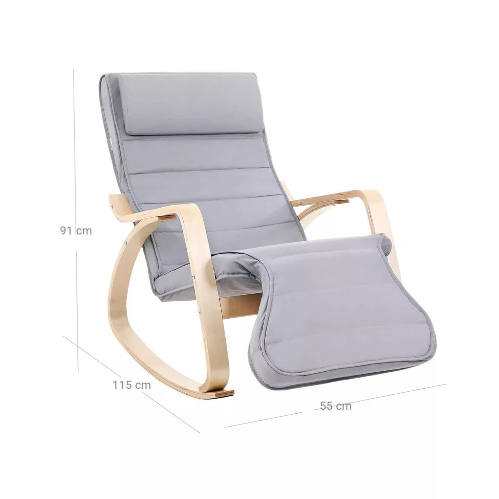 Ez a SONGMICS hintaszék ötvözi a klasszikus dizájnt a modern kényelemmel. A nyírfa furnérból készült ívelt váz és a világosszürke pamut kárpitozás tökéletesen illeszkedik bármilyen lakberendezési stílushoz. Az 5 pozícióba állítható lábtartó és az ergonomikus kialakítás maximális kényelmet biztosít.