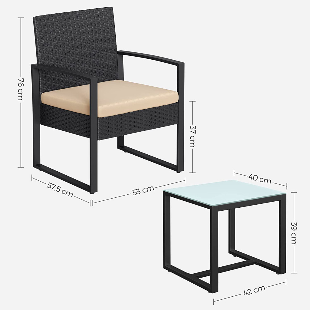 A porfestett acél váz és az időjárásálló polyrattan fonat tartós használatot biztosít, miközben a bézs színű párnák kellemes kontrasztot alkotnak a fekete rattanhatású felületekkel. A bútor szett könnyen összeszerelhető és sokoldalúan használható erkélyen, teraszon vagy a kertben.