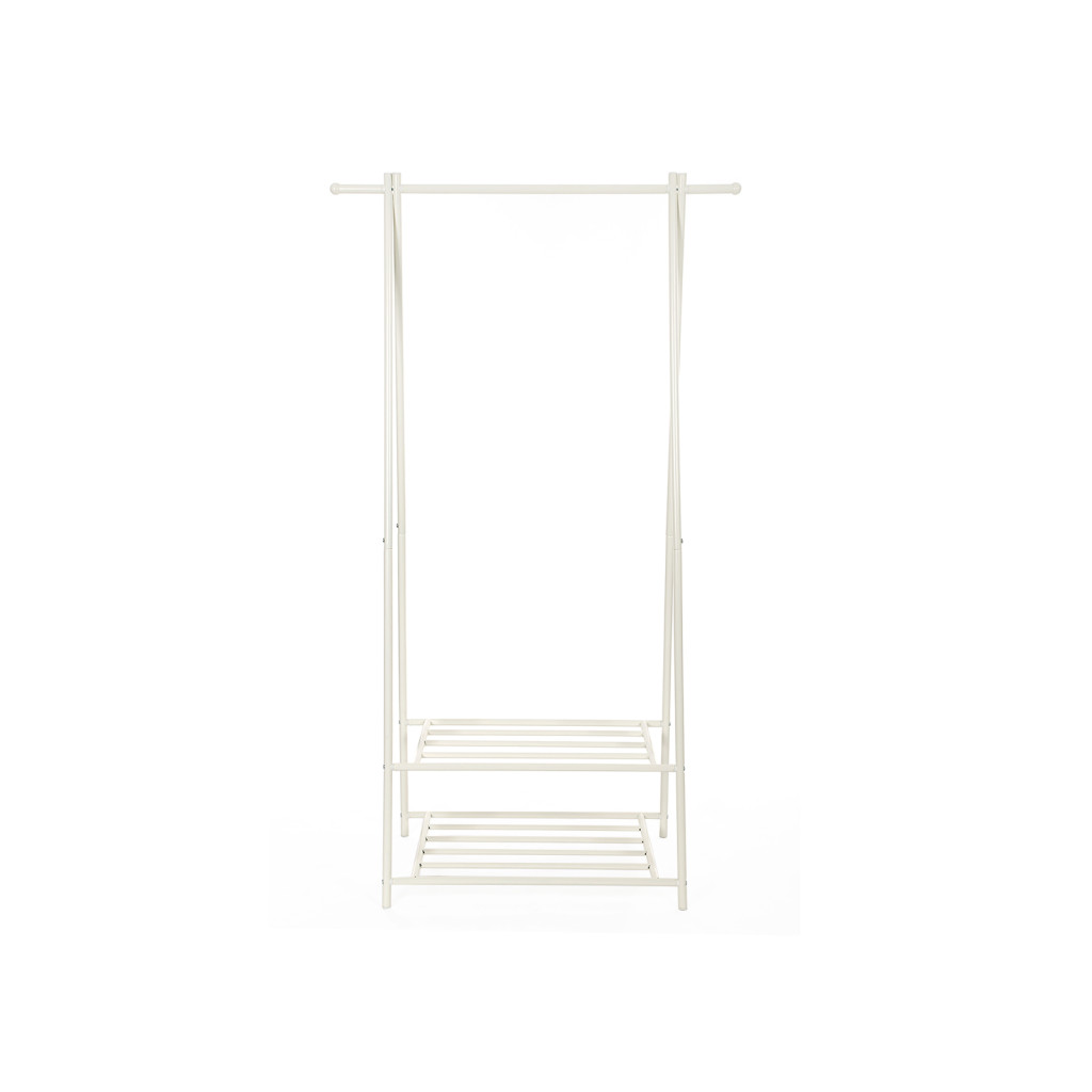 A ruhaakasztó rúd mellett két praktikus polc található, amelyek ideálisak cipők, táskák vagy tárolódobozok elhelyezésére. Az állvány kompakt mérete ellenére jelentős tárolókapacitást kínál, így tökéletes választás kisebb lakásokba vagy gardróbhelyiségekbe.