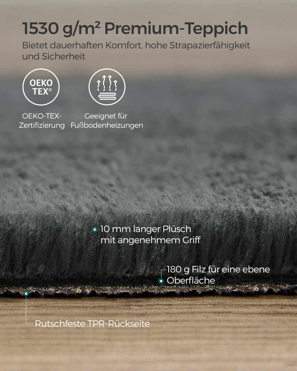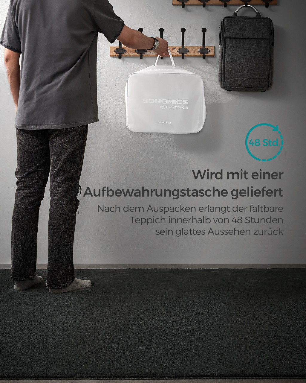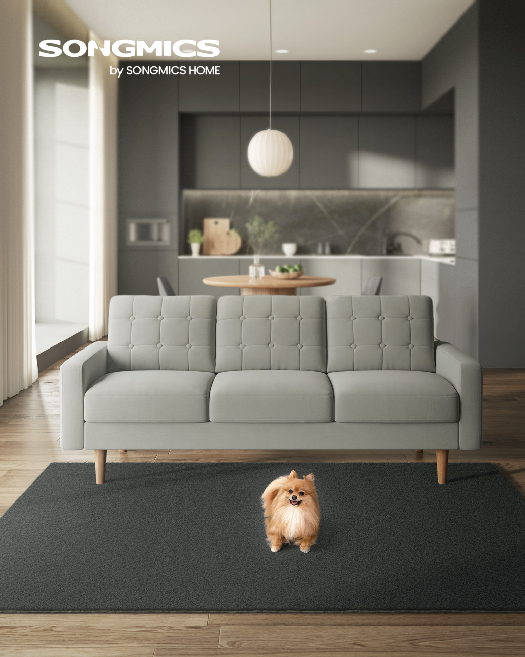 Ez a modern SONGMICS szőnyeg egyesíti a luxus kényelmet a praktikussággal. A 100% poliészter szálakból készült szőnyeg különlegesen puha tapintást biztosít, miközben a TPR csúszásgátló bevonat maximális biztonságot nyújt minden padlótípuson.