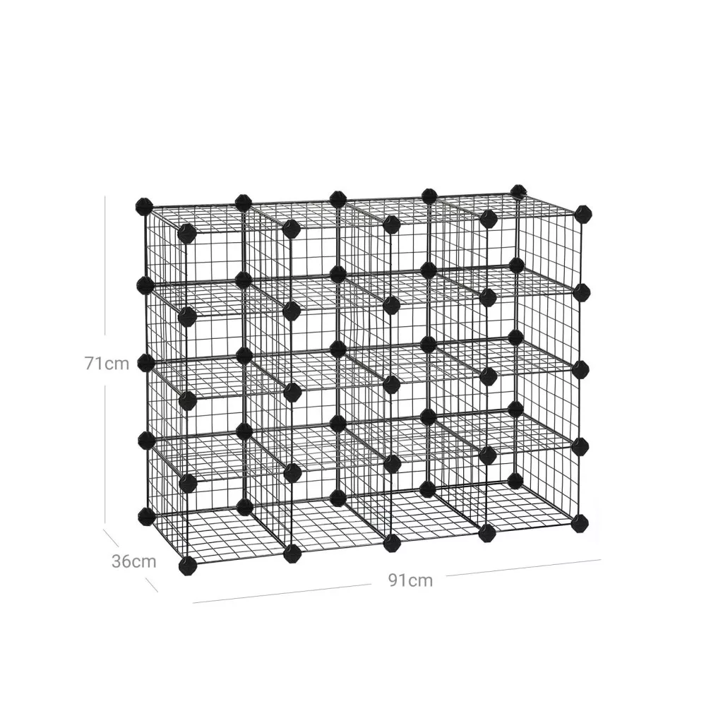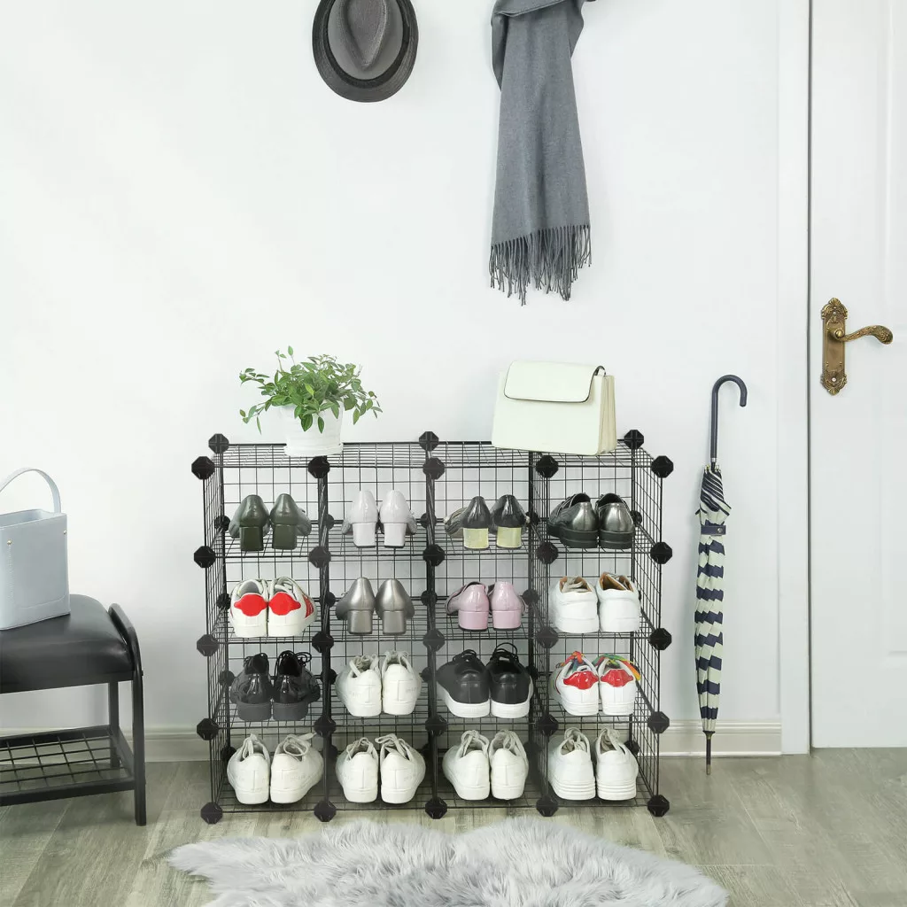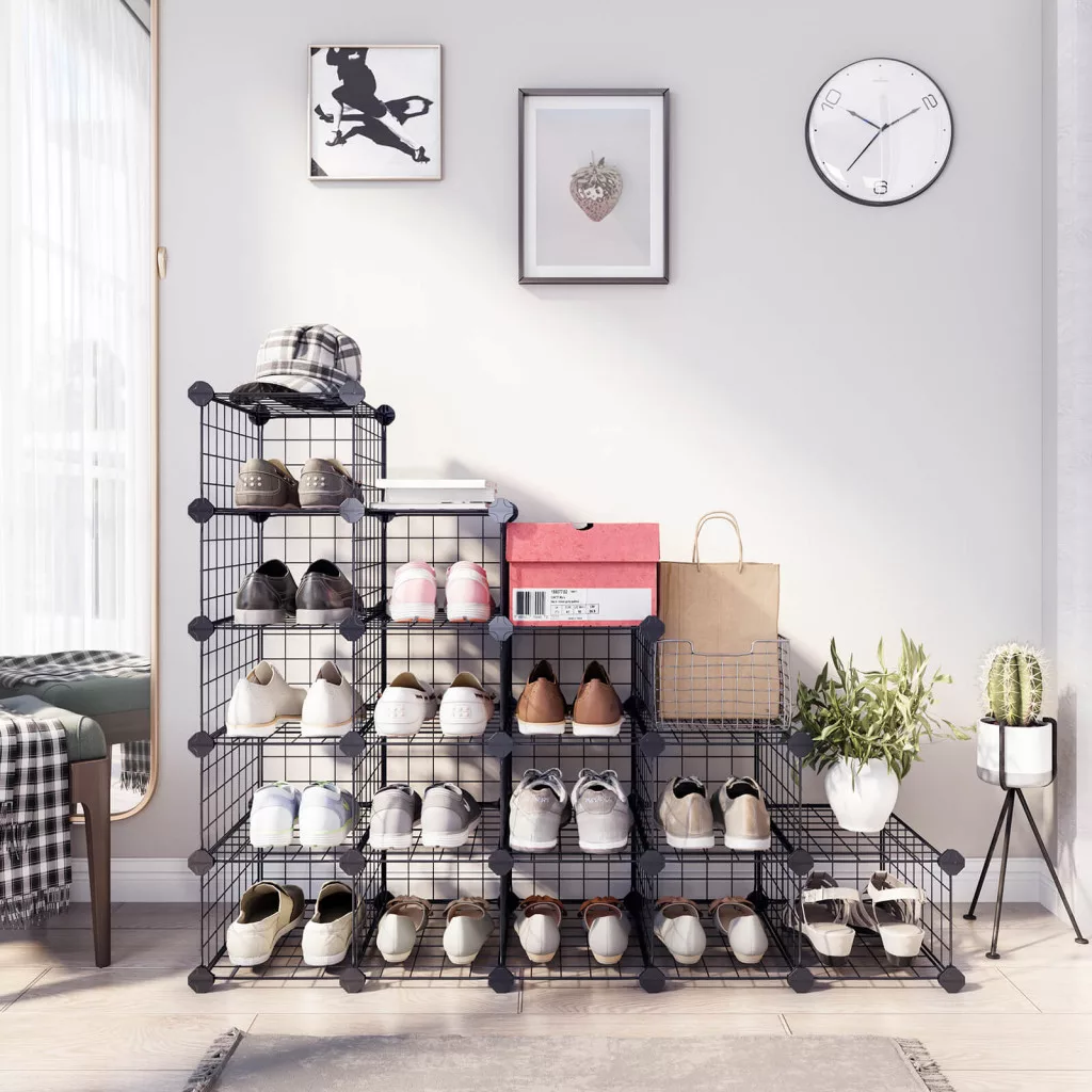 Sokoldalú, DIY cipőtároló rendszer fém hálós kialakítással, amely akár 16 pár cipő tárolására alkalmas és tetszés szerint alakítható.