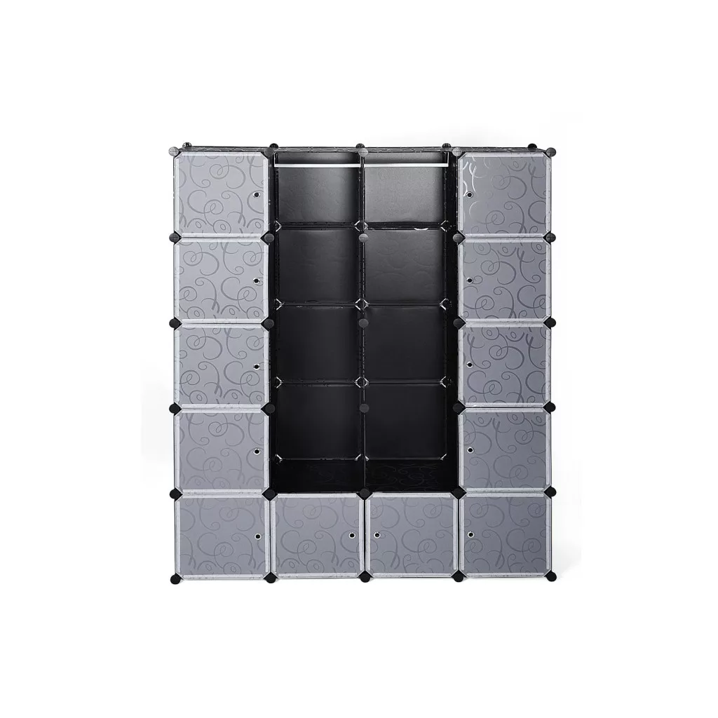 Ez a modern moduláris szekrényrendszer tökéletes megoldást nyújt a rendezett tároláshoz. A fekete-szürke színkombináció és a dekoratív mintás panelek elegáns megjelenést kölcsönöznek, miközben a praktikus kialakítás maximális helykihasználást biztosít. A két akasztórúd és a számos tárolórekesz lehetővé teszi ruhák, cipők és kiegészítők rendszerezett tárolását.