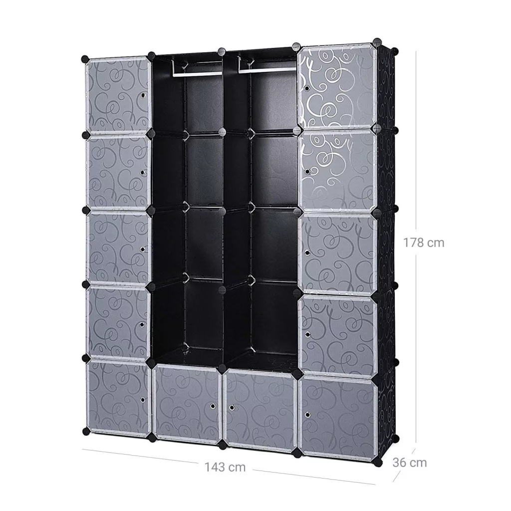 Sokoldalú, moduláris ruhásszekrény 858 literes tárolókapacitással, két akasztórúddal és dekoratív mintás panelekkel a stílusos tárolásért.