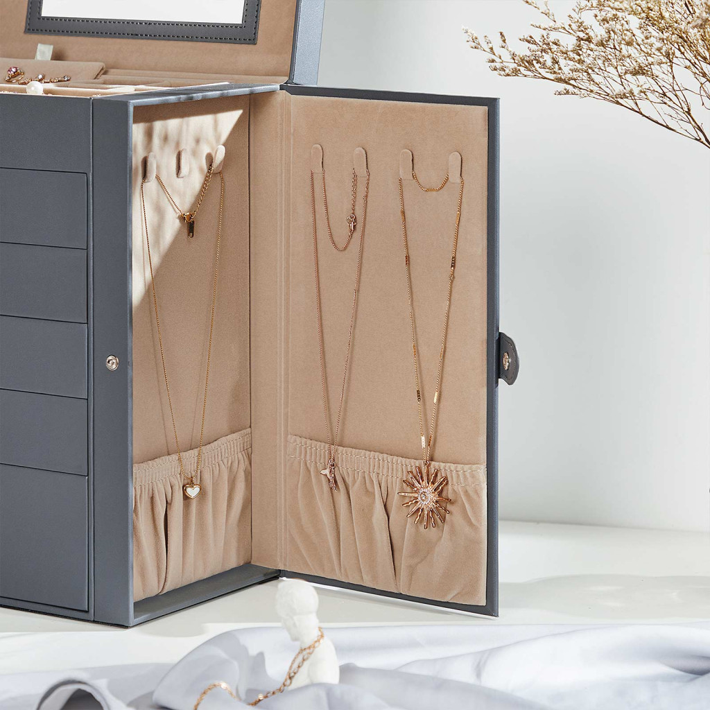 SONGMICS Nagy Ékszertartó Doboz 6-Szintes Szürke Műbőr Ékszerdoboz Tükörrel