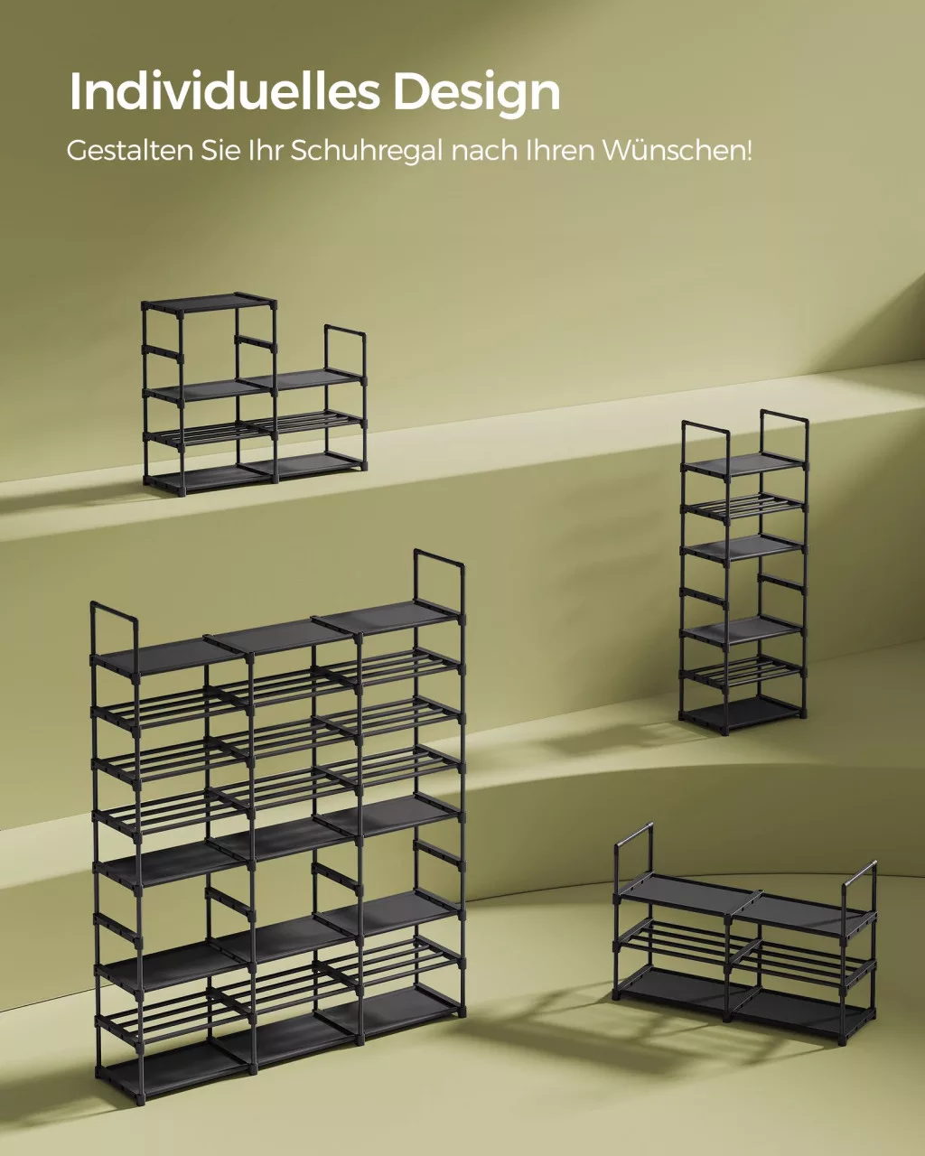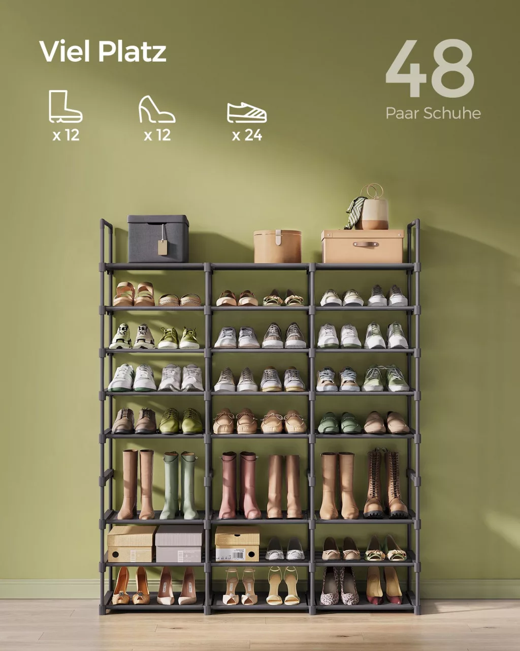 Nagykapacitású, testreszabható cipőtároló rendszer akár 48 pár cipő tárolására, stabil acélvázzal és tartós nemszőtt szövet polcokkal.
