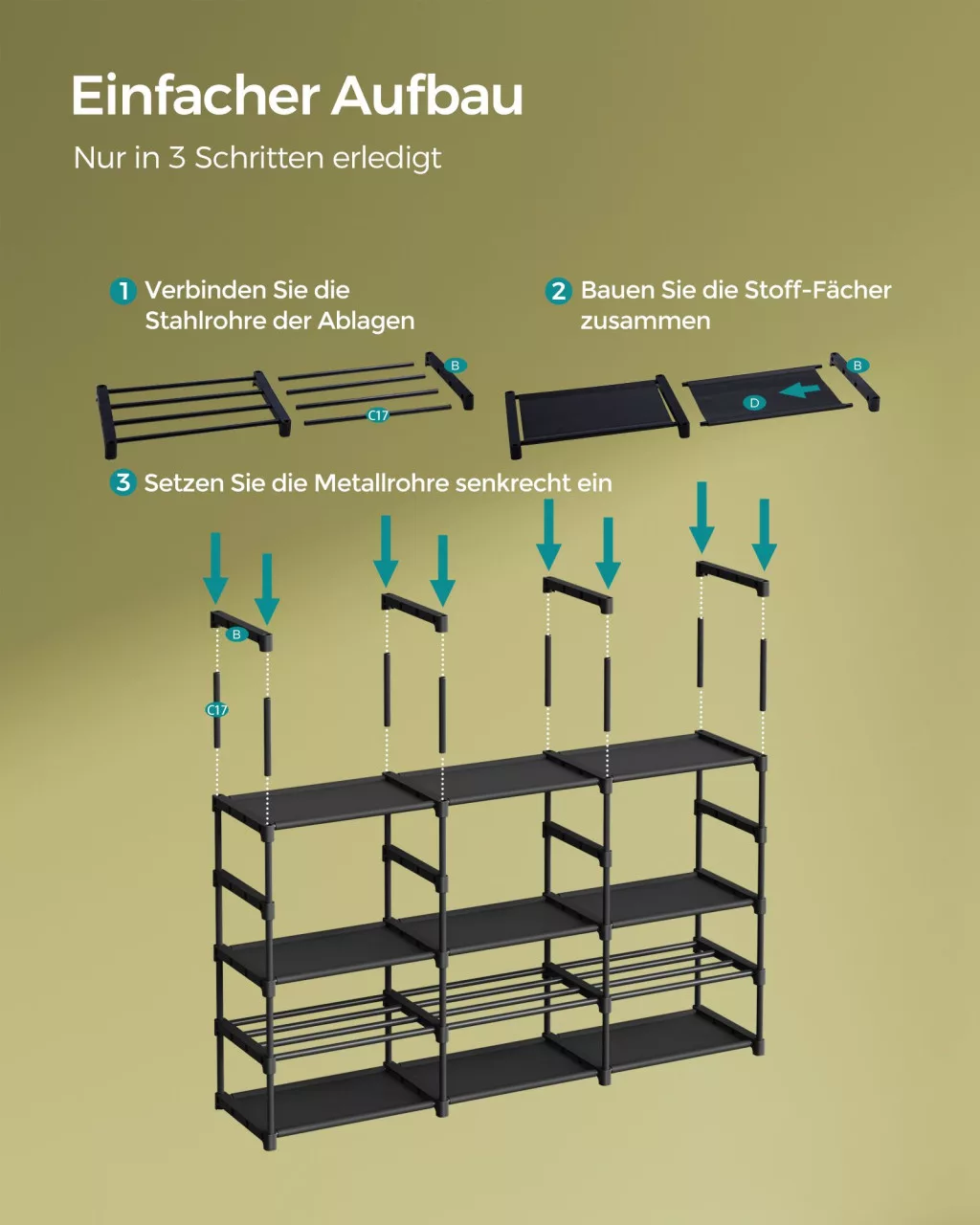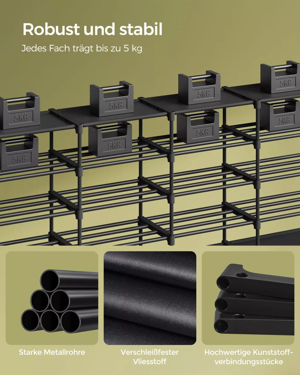 Az állvány nemcsak praktikus, de tartós is: a minőségi acélcsövek és a kopásálló nemszőtt szövet polcok hosszú élettartamot garantálnak. A szerkezet könnyen összeállítható, és igény szerint kisebb egységekre is bontható, így tökéletesen alkalmazkodik az Ön tárolási igényeihez.