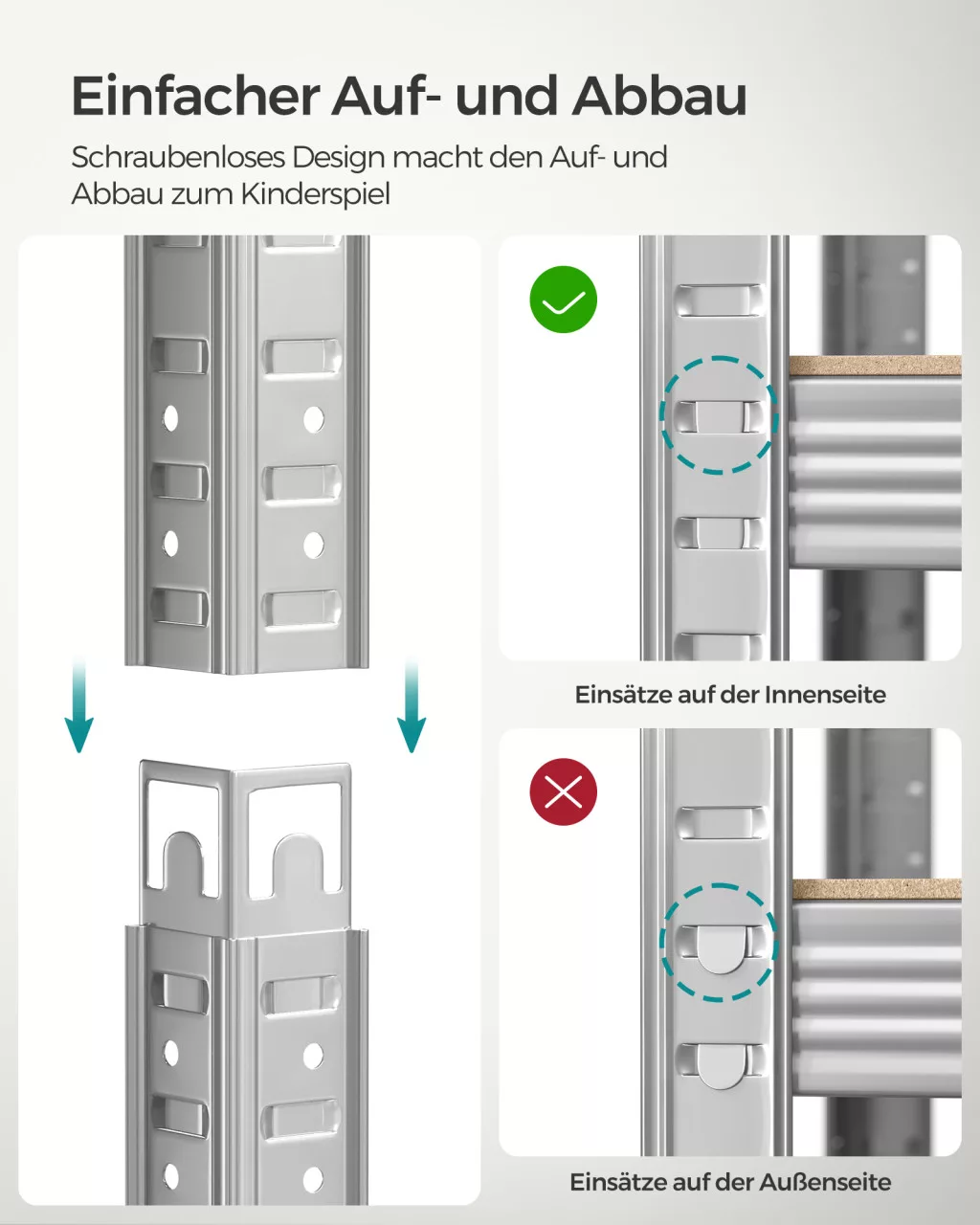 Az állvány különlegessége, hogy szerszámok nélkül összeszerelhető, és a polcok 5 cm-enként állíthatók. Igény szerint két külön egységre is bontható, így rugalmasan alakítható a rendelkezésre álló térhez.