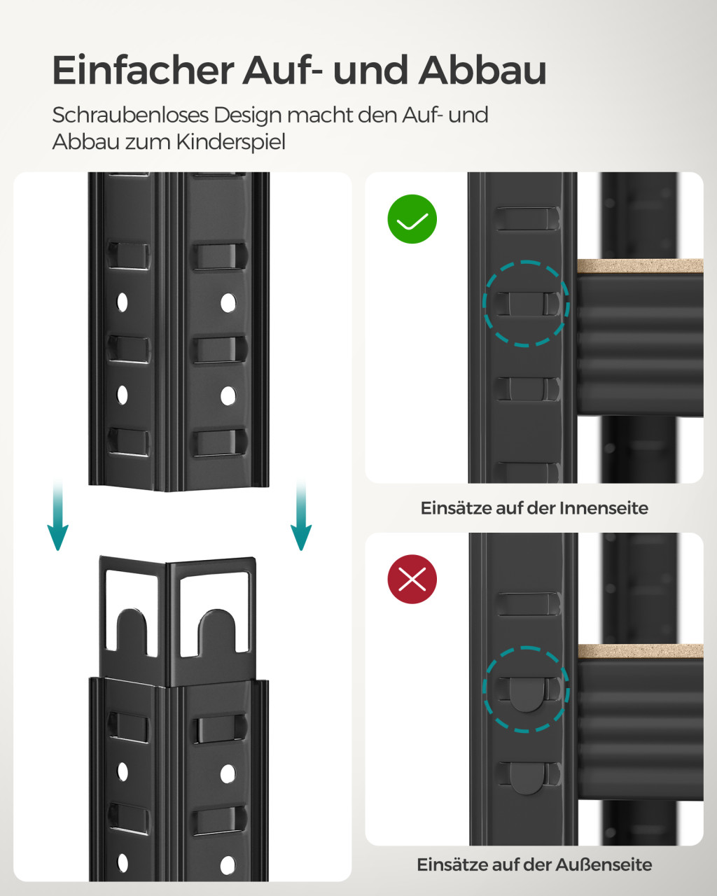 A polcok 5 cm-enként állítható magassága maximális rugalmasságot biztosít, és a rendszer könnyen két külön egységre osztható. A szerszámmentes összeszerelés és a falhoz rögzítő készlet további előnyöket jelentenek a biztonságos használat érdekében.