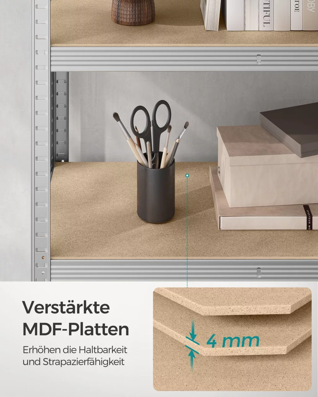 Ez a robusztus acél polcrendszer tökéletes megoldást nyújt a garázs, műhely vagy raktár rendszerezéséhez. A stabil acélváz és az MDF polcok kombinációja biztosítja a maximális teherbírást, miközben minden polc 175 kg terhelést bír el. Az 5 cm-enként állítható polcmagasság lehetővé teszi a különböző méretű tárgyak optimális tárolását.