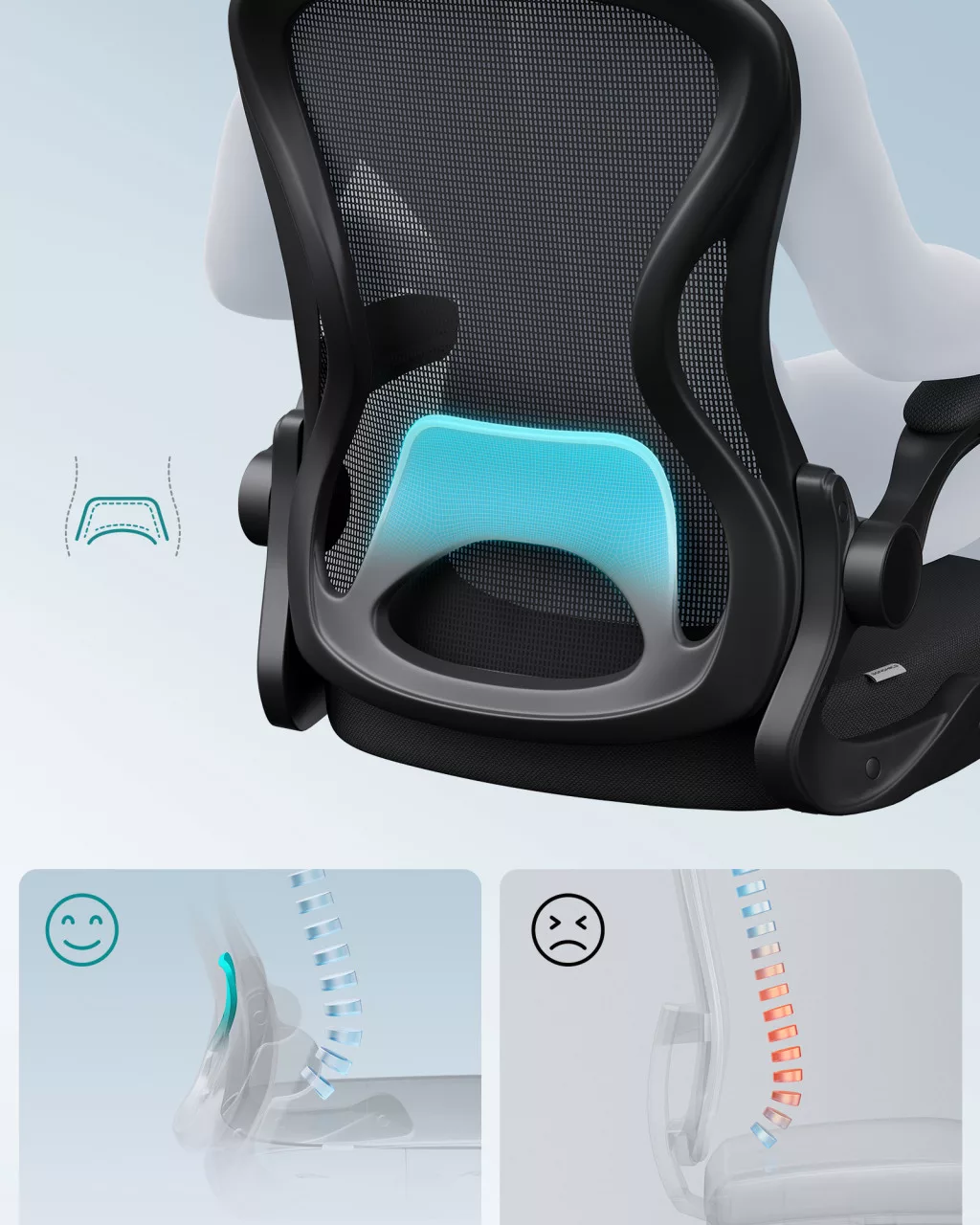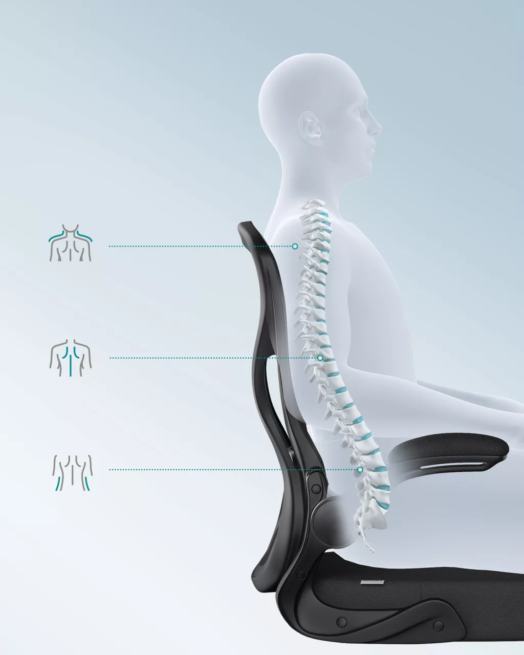• Ergonomikus deréktámasz: A háttámla tökéletesen illeszkedik a test vonalaihoz, a párnázott deréktámasz pedig optimálisan támogatja az alsó hátat, hatékonyan megelőzve a hátfájást hosszú munkaórák alatt