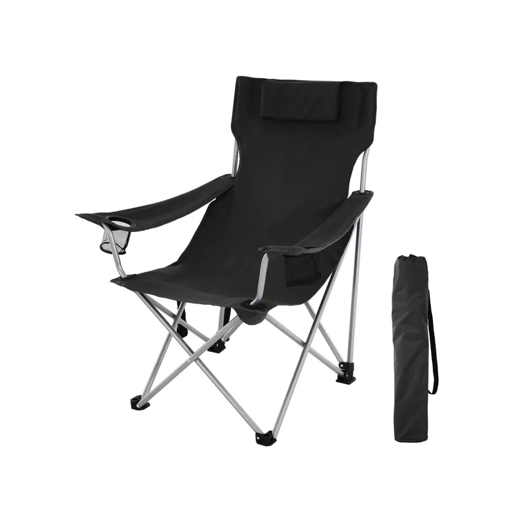 Stabil, kényelmes összecsukható kemping szék fejtámlával és pohártartóval, amely tökéletes társ a szabadtéri kikapcsolódáshoz.