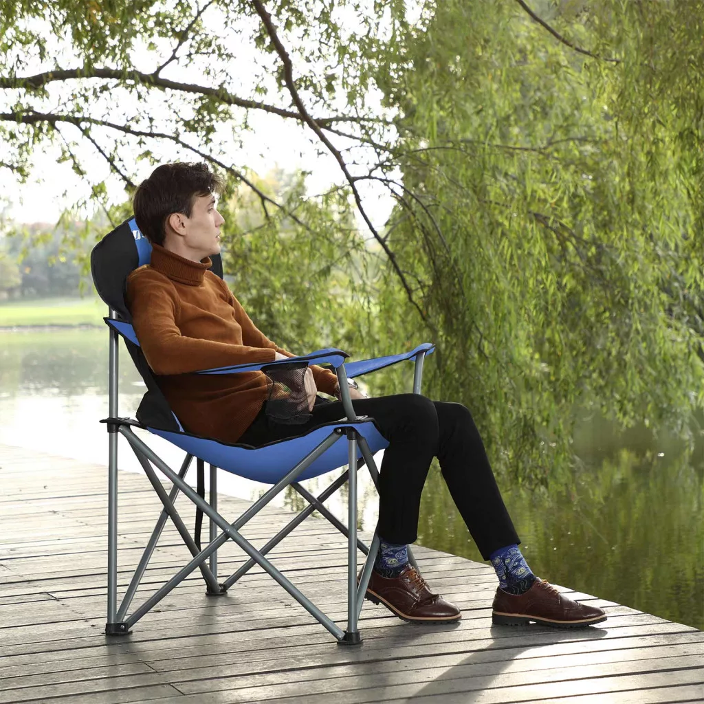 Strapabíró, kényelmes kempingszék szivacsos párnázással és pohártartóval, amely akár 250 kg terhelést is elbír. Tökéletes választás kempingezéshez, horgászathoz vagy kerti pihenéshez.