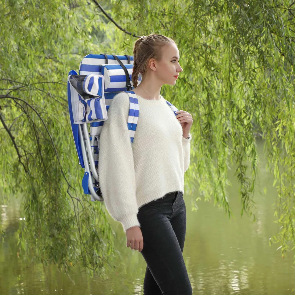 Stílusos és praktikus összecsukható strand szék állítható háttámlával és fejtámasszal, amely hátizsákként is hordozható. Ideális strandoláshoz, kempingezéshez és szabadtéri kikapcsolódáshoz.