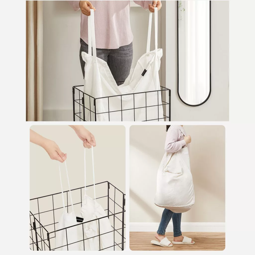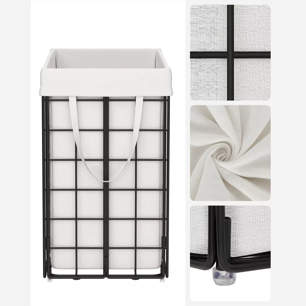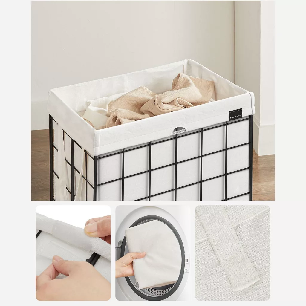 A SONGMICS szennyestartó kosár ötvözi a modern dizájnt a praktikussággal. A fekete fémvázas szerkezet és a fehér mosható zsák tökéletesen illeszkedik bármilyen fürdőszobai vagy hálószobai környezetbe. A 90 literes kapacitás bőséges helyet biztosít a család szennyesének tárolására.