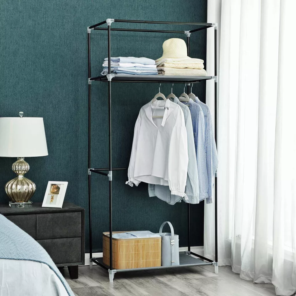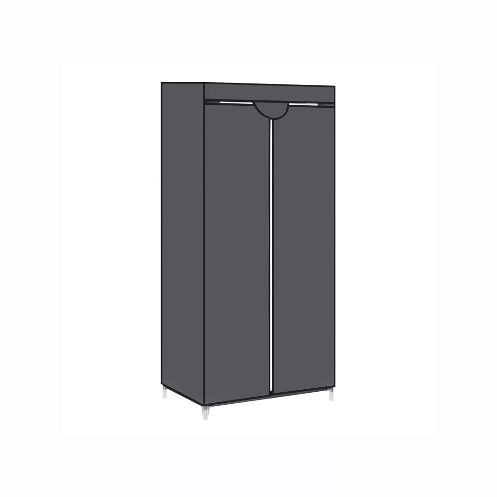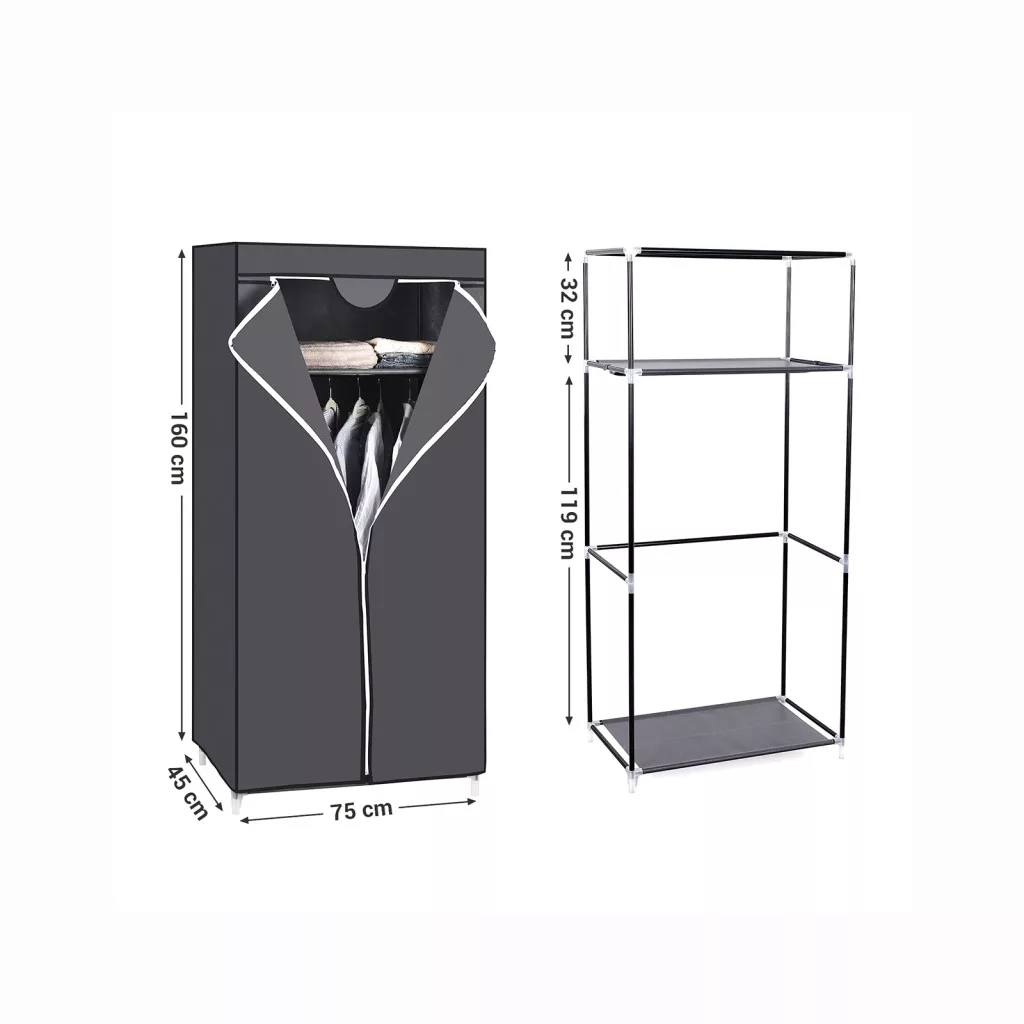 Praktikus és helytakarékos szövet ruhásszekrény akasztórúddal és polcokkal, ideális ruhák, cipők és kiegészítők tárolására.