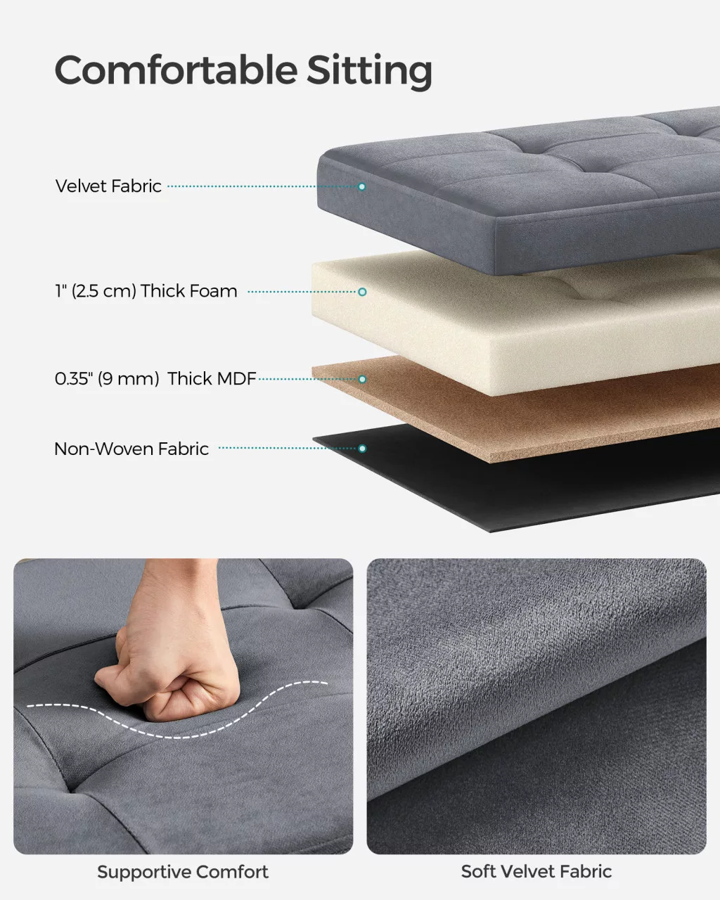 A SONGMICS tároló ülőpad tökéletes megoldás azok számára, akik a funkcionalitást és az elegáns megjelenést egyaránt fontosnak tartják. A palaszürke bársony kárpit és a gondos varrások kifinomult hangulatot teremtenek bármely helyiségben, miközben a vastag MDF panelekkel megerősített szerkezet akár 300 kg terhelést is elbír. A nagy sűrűségű habszivacs töltet és a puha bársony felület kényelmes ülőélményt biztosít, így ideális extra ülőhelyként vagy lábzsámolyként.
