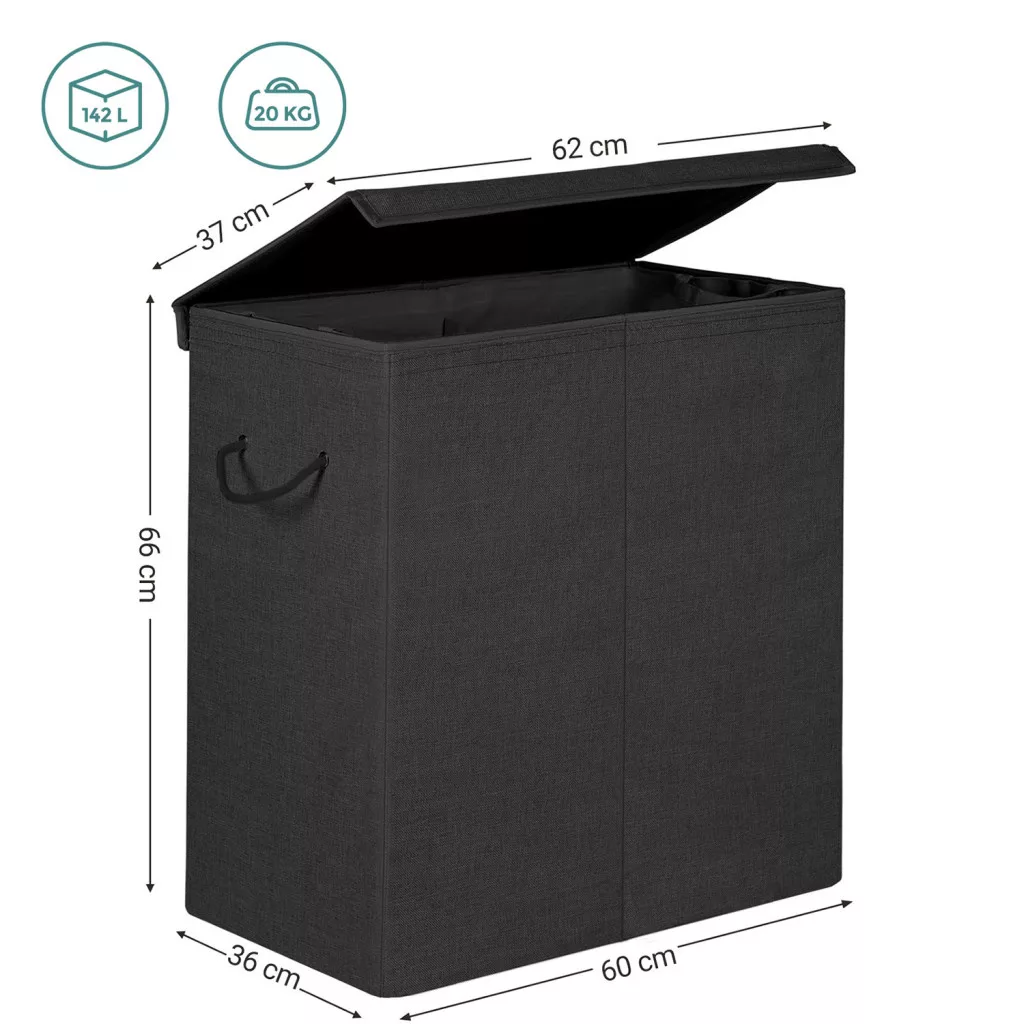 Nagy kapacitású, 142 literes osztott szennyestartó kosár mágneses fedéllel és kivehető mosható zsákkal, amely tökéletes megoldást nyújt a ruhák rendszerezett tárolására.