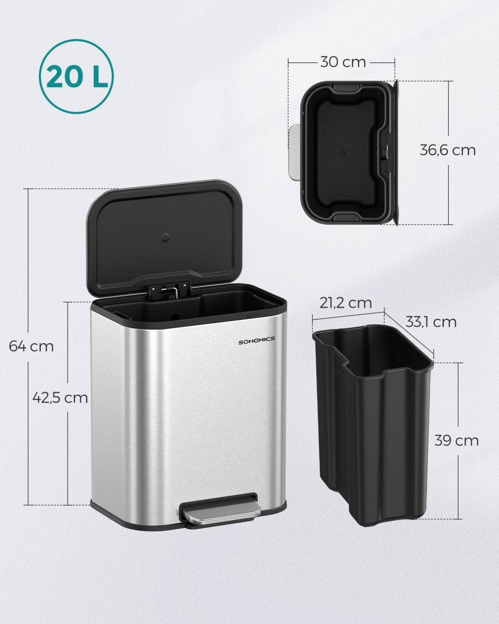 A kivehető belső vödör megkönnyíti a szemetes ürítését, a széles pedál pedig stabil működést biztosít. A csúszásgátló talpak és a kompakt méret lehetővé teszik, hogy a kuka stabilan álljon akár szűk helyeken is.