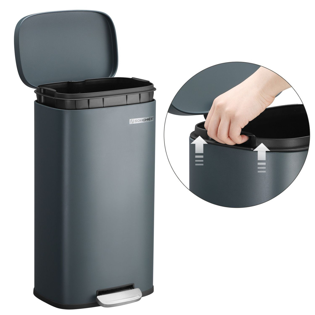 A SONGMICS 30 literes pedálos szemeteskuka ötvözi az elegáns megjelenést a praktikus funkcionalitással. A füstszürke acél külső nem csak esztétikus, de tartós is, míg a puha záródási mechanizmus biztosítja a csendes működést. A pedálos nyitórendszer lehetővé teszi a higiénikus, érintésmentes használatot.