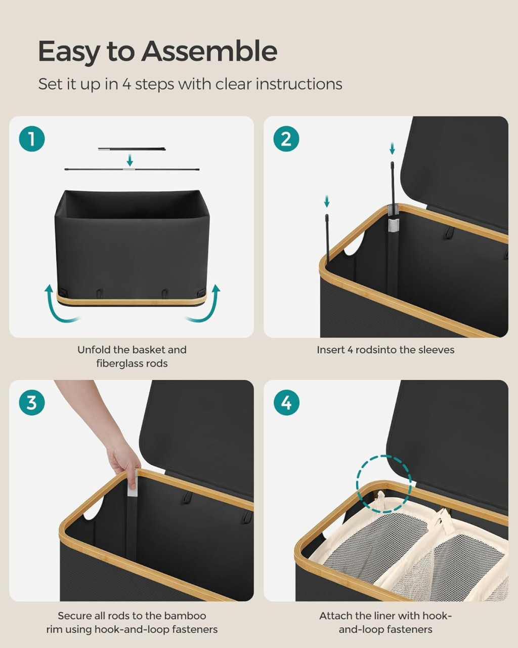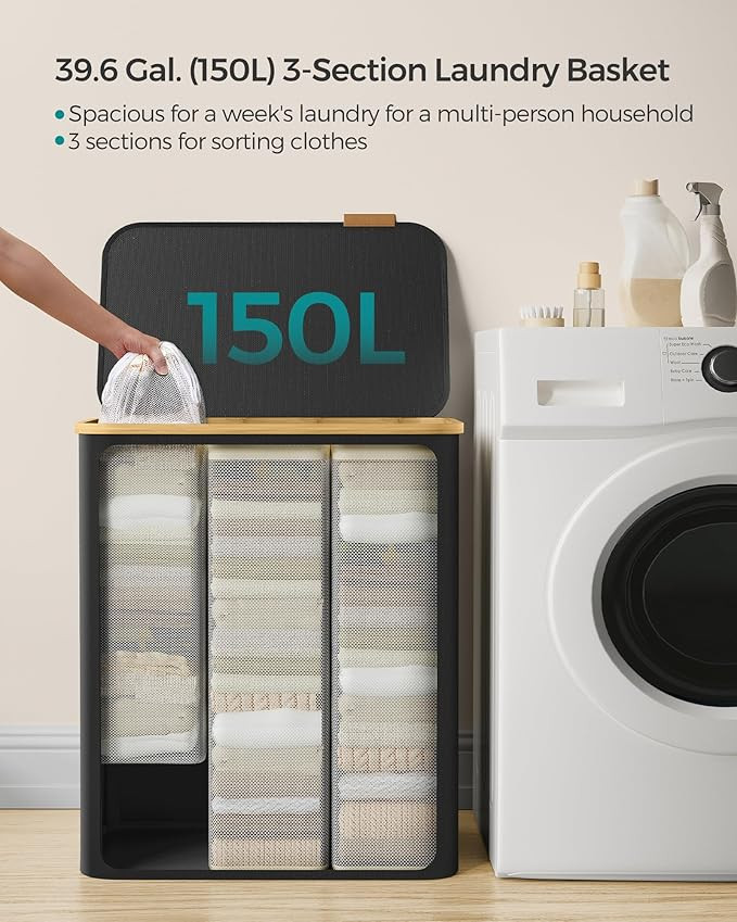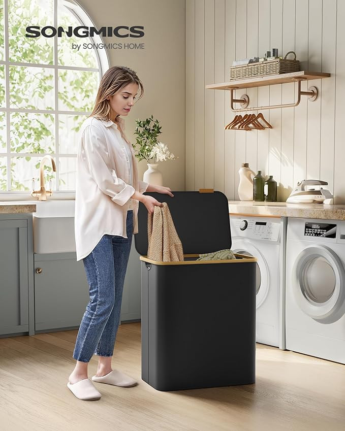SONGMICS Premium 150L Háromrekeszes Szennyestartó Bambusz Fogantyúval Fekete