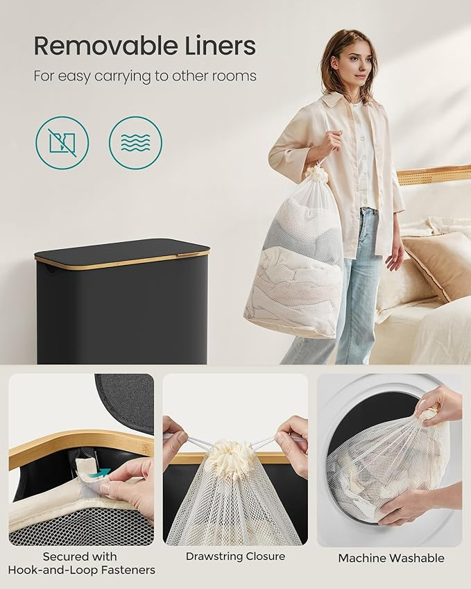 Elegáns, nagy kapacitású szennyestartó három rekesszel, kivehető hálós betétekkel és bambusz díszítéssel, amely tökéletes megoldást nyújt a családi ruhanemű rendszerezett tárolására.
