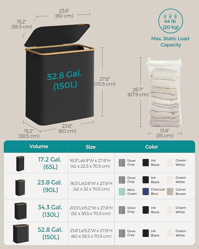Ez a prémium minőségű, 150 literes szennyestartó forradalmasítja a mosodai rutin kezelését. A három különálló rekesz lehetővé teszi a ruhák színek vagy anyagok szerinti hatékony szétválogatását, míg a kivehető hálós betétek megkönnyítik a mosógépbe való áthelyezést.