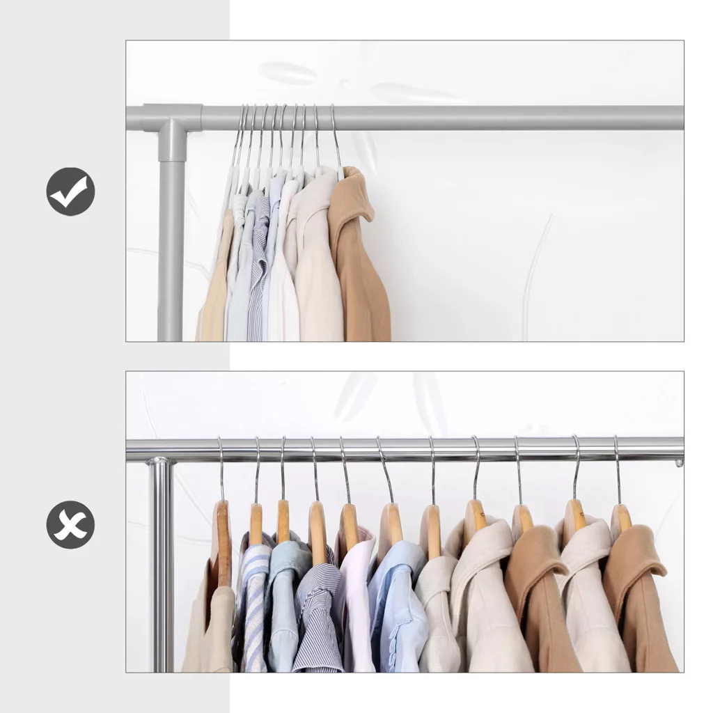A 360°-ban forgatható fémakasztó könnyű hozzáférést biztosít, míg a karcsú kialakítás maximalizálja a helykihasználást. Egy vállfa akár 5 kg terhelést is elbír, így télikabátok tárolására is alkalmas.