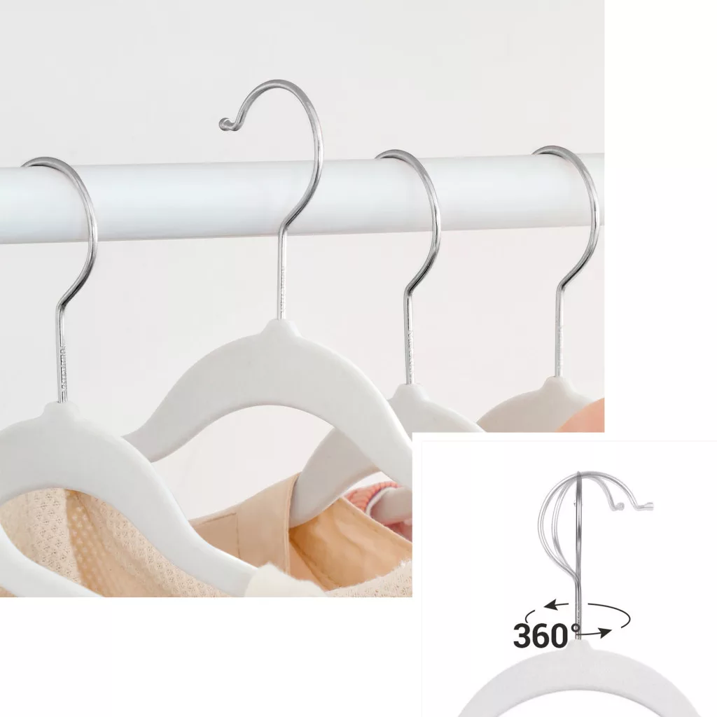 Prémium minőségű, vékony bársony vállfa szett 360°-ban forgatható fémakasztóval, amely tökéletes megoldást nyújt ruhái rendezett tárolására.