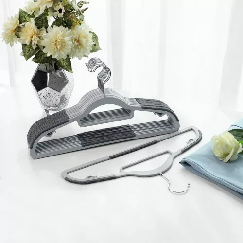 Kiváló minőségű, vékony kialakítású vállfakészlet csúszásgátló bevonattal és 360°-ban forgatható akasztóval, amely tökéletes megoldást nyújt ruhái rendezett tárolásához.
