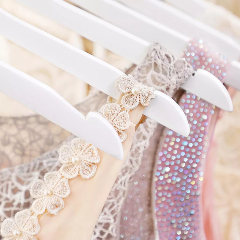 Elegáns fehér juharfa vállfa szett 360°-ban forgatható akasztóval és csúszásgátló bevágásokkal, amely tökéletesen megőrzi ruhái formáját.