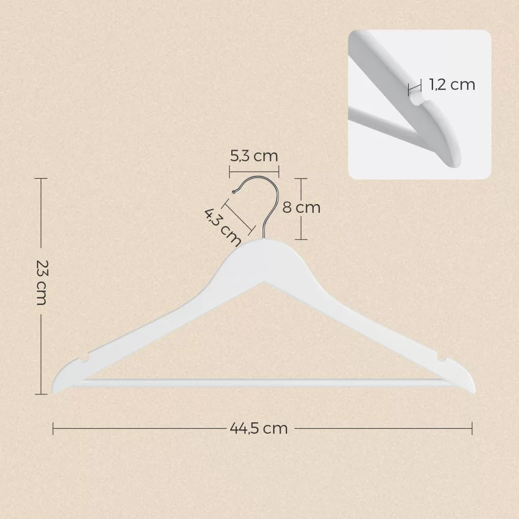 A masszív kivitelezés és az 5 kg-os teherbírás lehetővé teszi nehéz kabátok, öltönyök biztonságos tárolását is. A váll részen kialakított bevágások a spagettipántos felsők számára, valamint a nadrágok és sálak tárolására szolgáló keresztrúd még sokoldalúbbá teszi a használatot.