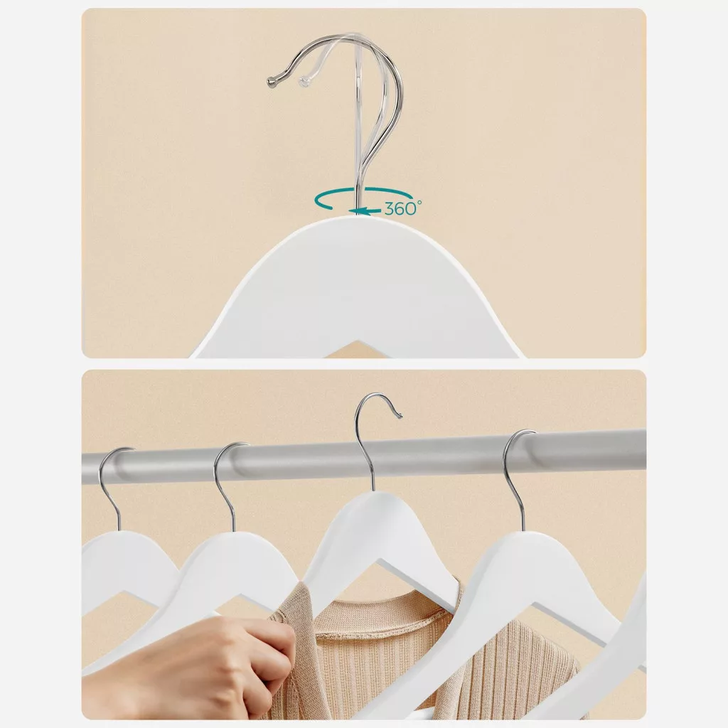 Prémium minőségű, gumibevonatos fa vállfa szett, amely tökéletesen védi ruháit és megakadályozza azok lecsúszását. A 360°-ban forgatható akasztóval és nadrágtartó rúddal minden ruhadarab számára ideális megoldást nyújt.
