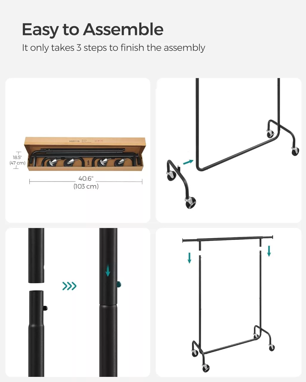 A kihúzható felső rúd 110-150 cm között állítható, így rugalmasan alakítható a rendelkezésre álló tér szerint. A négy 360°-ban elforduló kerék, melyből kettő fékezhető, könnyű mozgathatóságot biztosít, míg az alsó keresztrúd tökéletes cipőtárolóként szolgál.