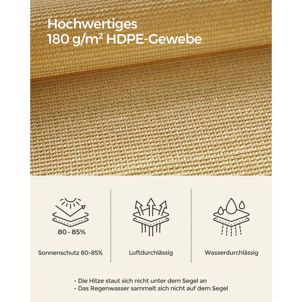 Ez a prémium minőségű napvitorla tökéletes megoldást nyújt a szabadtéri területek árnyékolására. A 180 g/m² sűrűségű HDPE anyag 85%-os UV-védelmet biztosít, miközben a speciális szövésnek köszönhetően légáteresztő és vízáteresztő tulajdonságokkal rendelkezik.