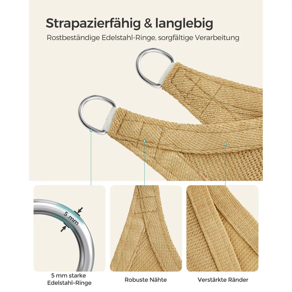 A megerősített varrások és a rozsdamentes acél D-gyűrűk hosszú élettartamot garantálnak. Az ívelt kialakítás megakadályozza a vitorla belógását és optimális feszességet biztosít.