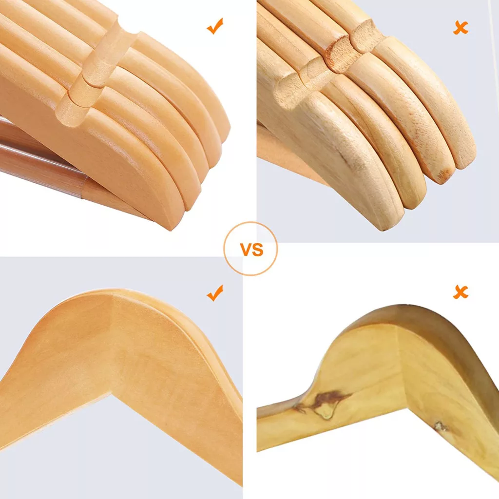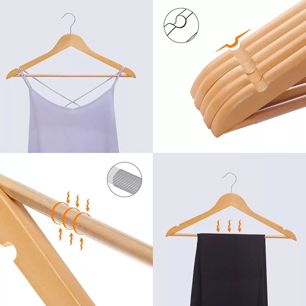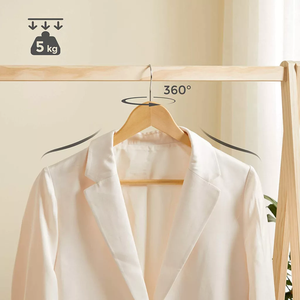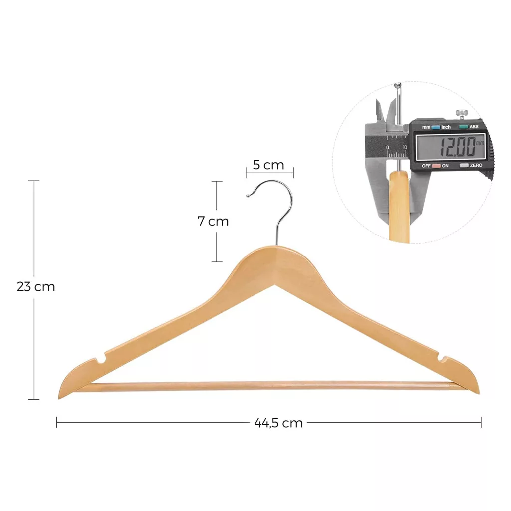 A SONGMICS juharfa vállfa szett egyesíti a funkcionalitást és az eleganciát. A kézzel polírozott, sima felületű vállfák kíméletesen óvják ruháit, miközben a válltartó mélyedések megakadályozzák a nemkívánatos gyűrődések kialakulását.