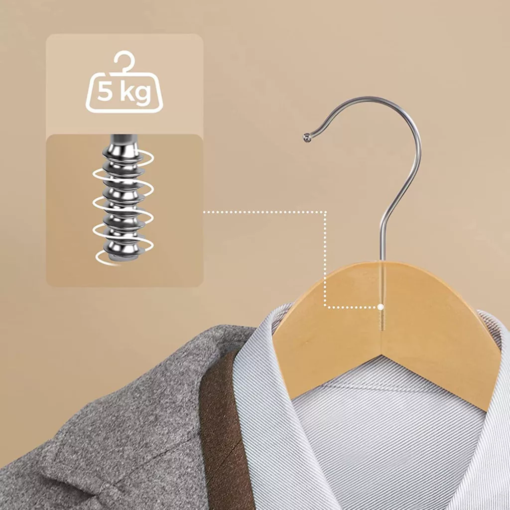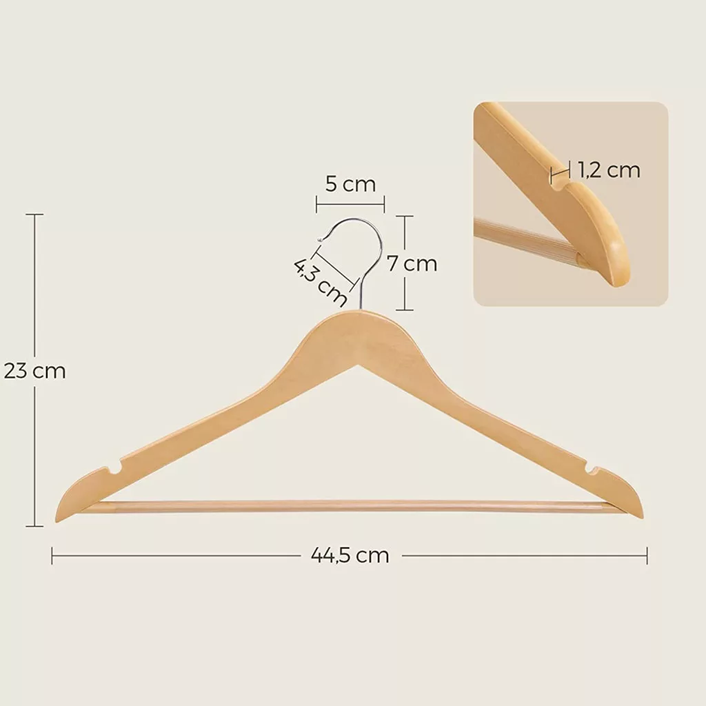 A SONGMICS prémium vállfa szett tömör juharfából készült, gondosan polírozott felülettel, amely megóvja ruháit a sérülésektől. A vállfák anatómiai kialakítása tökéletesen követi a vállak vonalát, így megelőzi a nemkívánatos gyűrődéseket és deformálódást.
