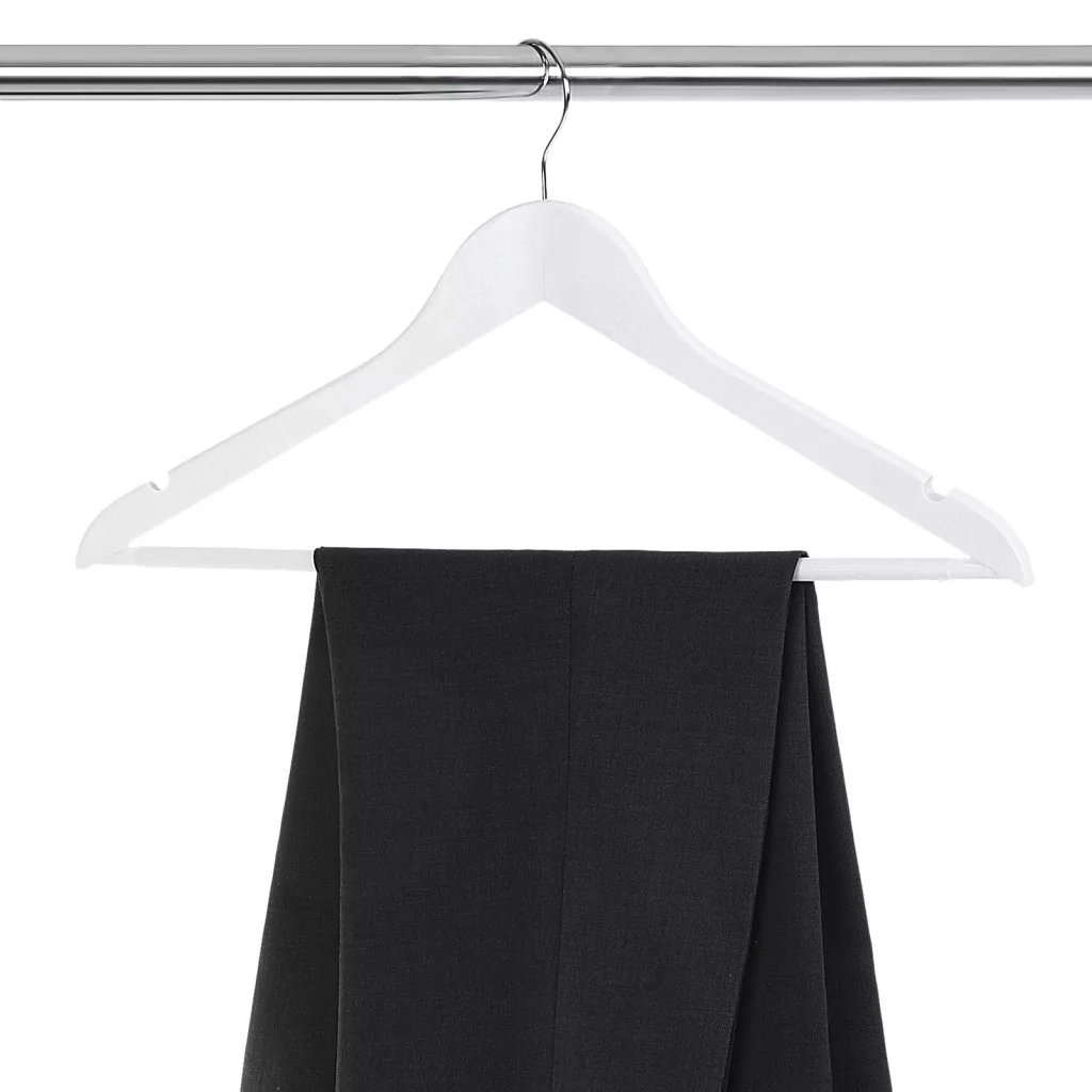 Elegáns, fehér juharfa vállfa szett 360°-ban forgatható akasztóval és csúszásgátló nadrártartóval, amely tökéletes megoldást nyújt ruhái professzionális tárolásához.