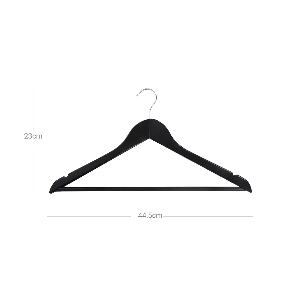 Elegáns, fekete juharfa vállfa szett 360°-ban forgatható akasztóval és csúszásgátló nadrártartóval, amely tökéletes öltönyök, kabátok és ingek tárolására.