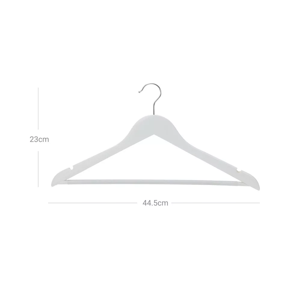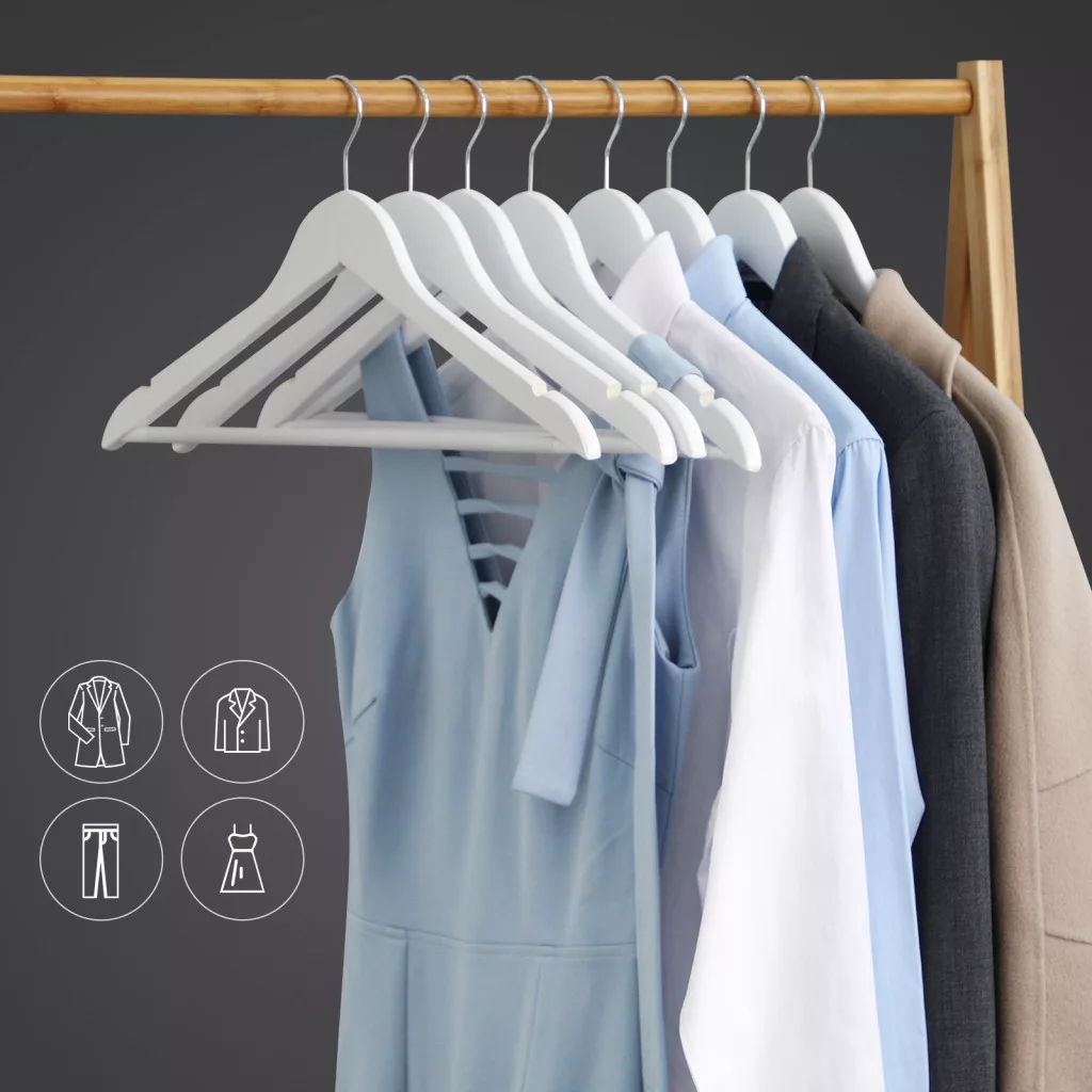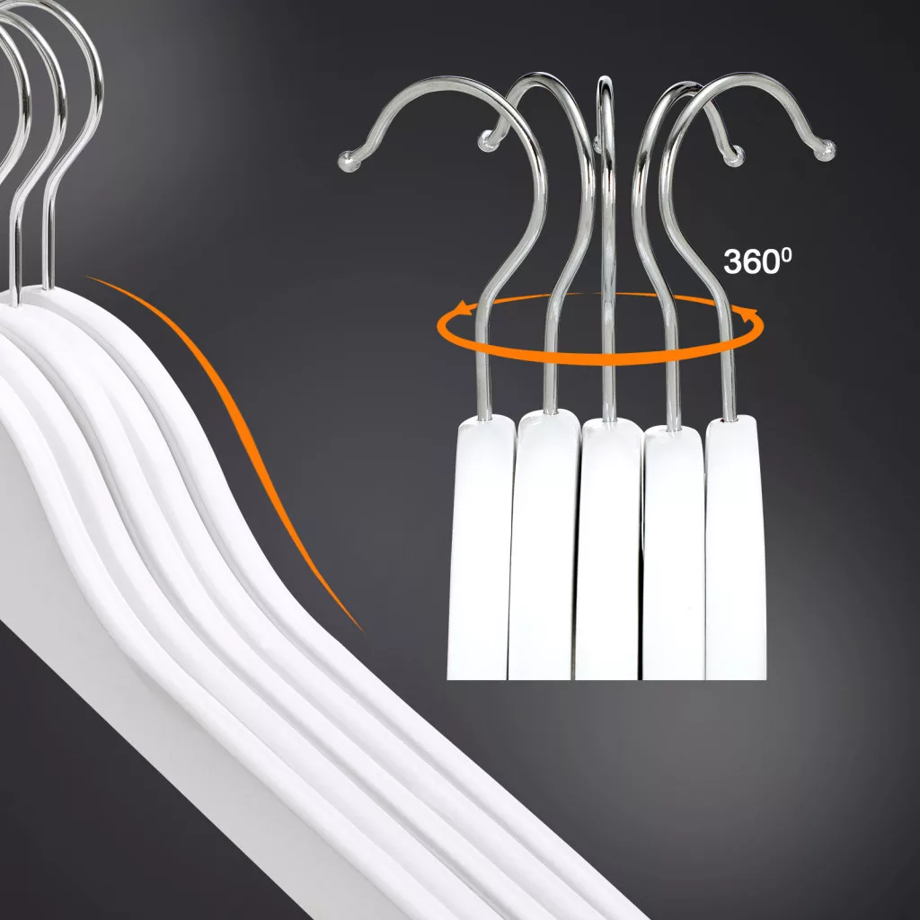Elegáns, fehér juharfa ruhaakasztó szett 360°-ban forgatható akasztóval és csúszásgátló nadrágtartóval, amely tökéletes megoldást nyújt ruhái professzionális tárolásához.