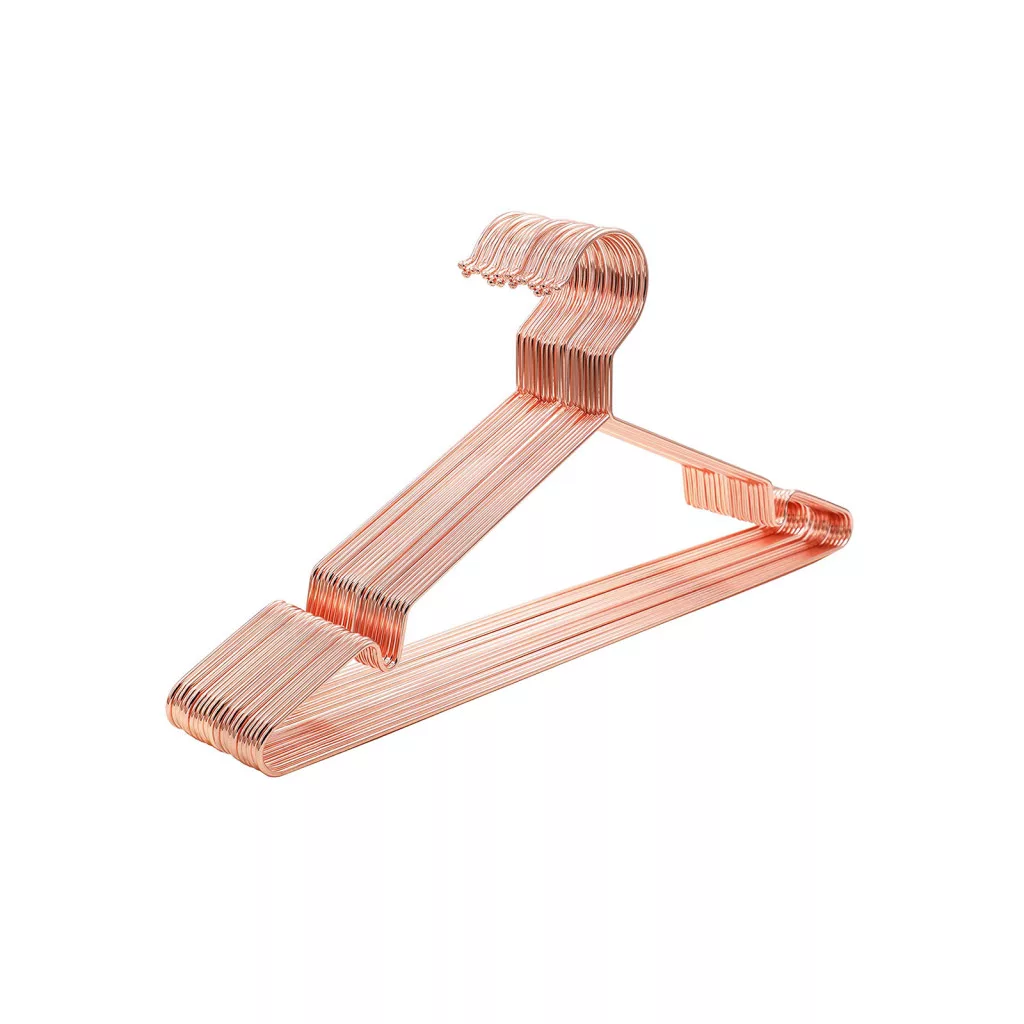 Elegáns, rozéarany króm vállfa szett, amely ötvözi a stílust és funkcionalitást. Vékony kialakításának köszönhetően maximalizálja a gardrób tárolókapacitását.