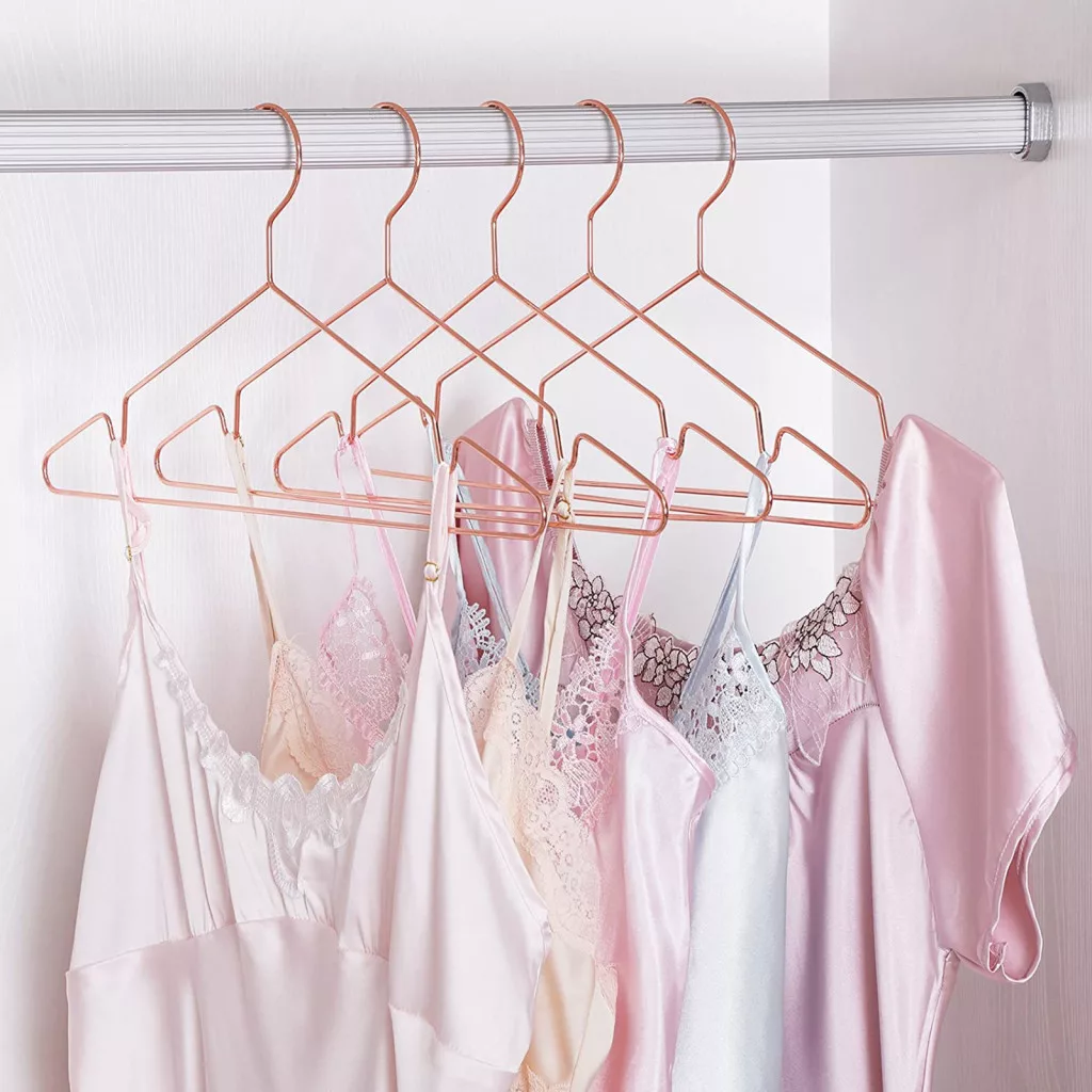 A SONGMICS rozéarany vállfa kollekció tökéletes választás a modern otthonokba. A krómbevonatú, rozéarany felület nem csak esztétikus megjelenést kölcsönöz, de tartósságot is biztosít. A vállfák speciális barázdált kialakítása megakadályozza a ruhák lecsúszását.