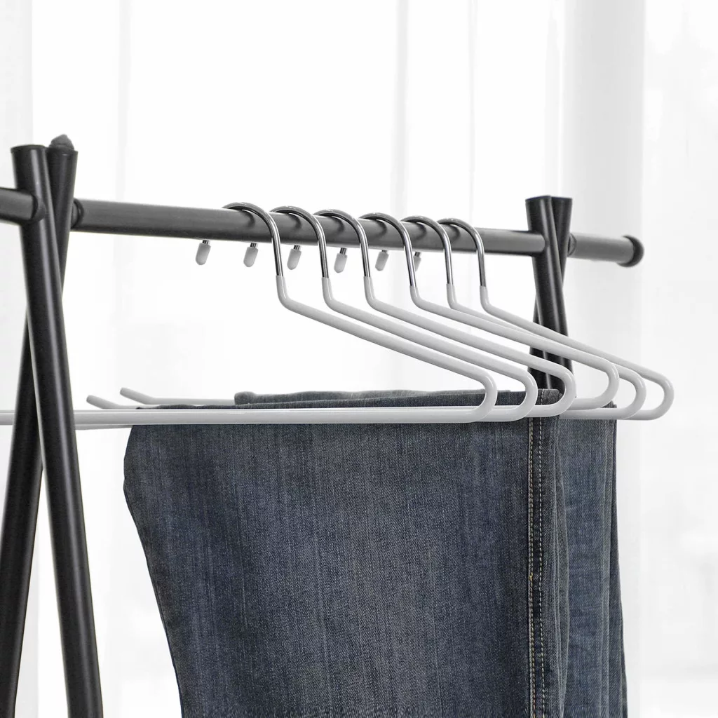 Strapabíró, PVC bevonatú fém nadrágakasztók csúszásgátló felülettel, amelyek tökéletesen alkalmasak nadrágok, sálak és egyéb ruhadarabok tárolására.