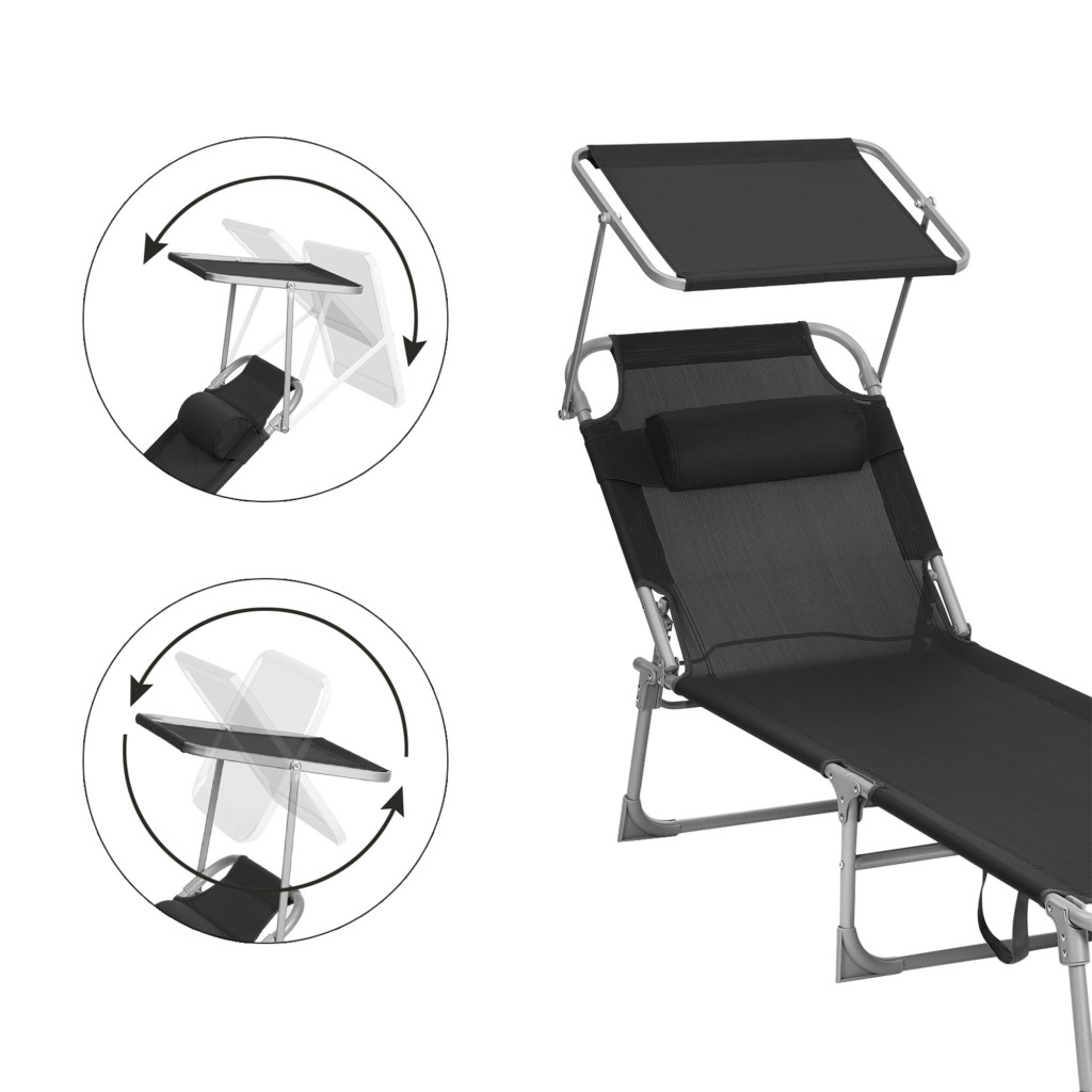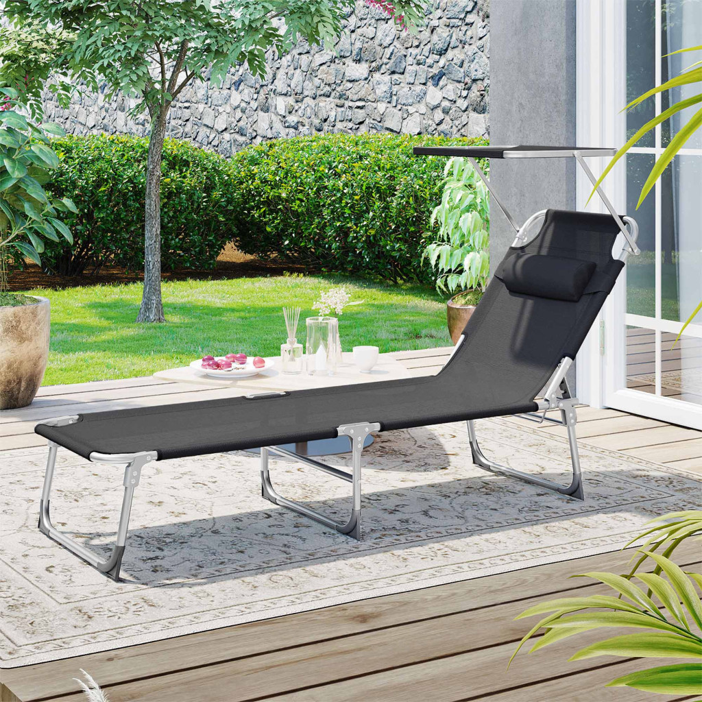 Állítható háttámlás, könnyű és összecsukható napozóágy beépített napellenzővel és fejtámasszal, ideális kerti pihenéshez és napozáshoz.