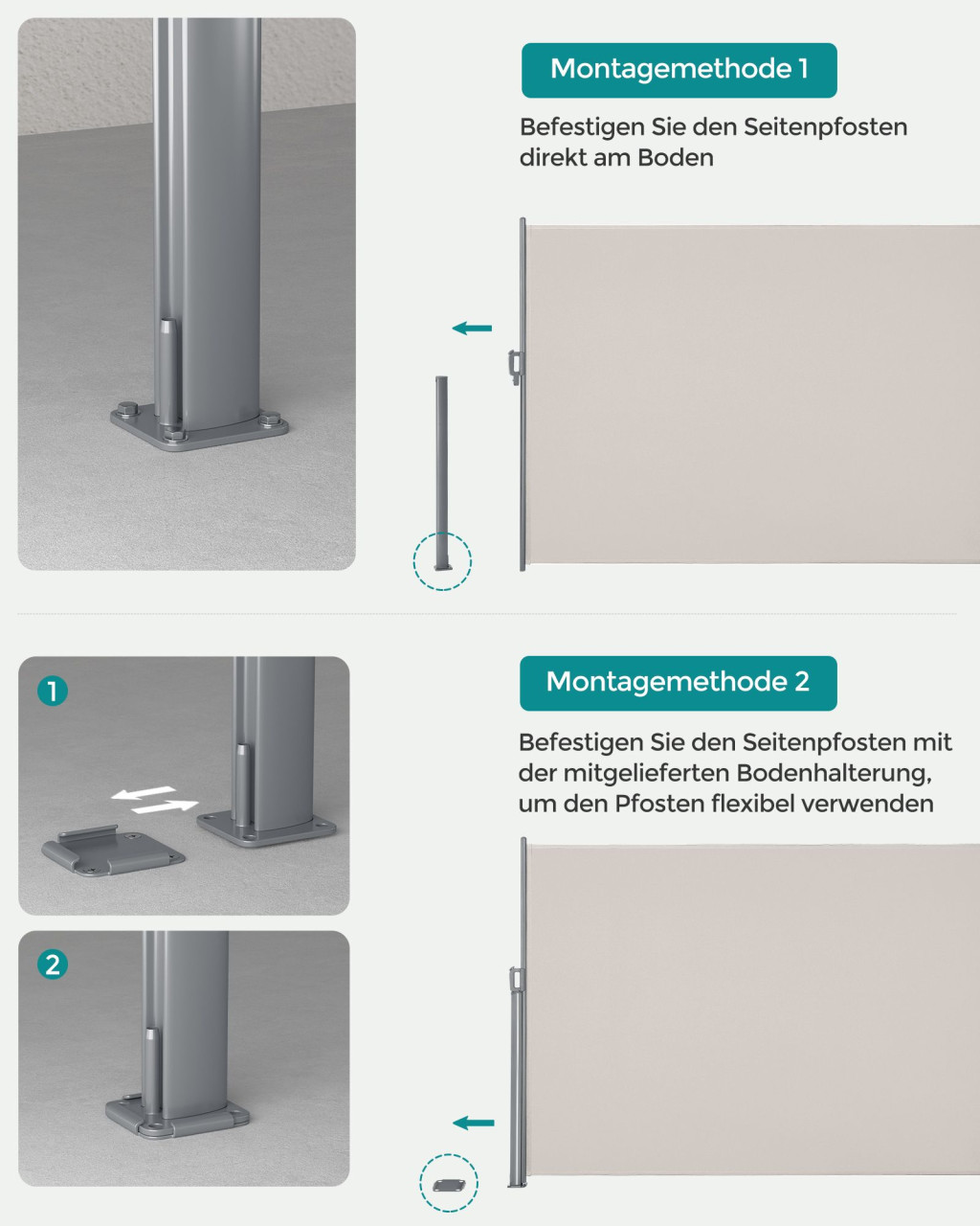A napellenző könnyen telepíthető és használható, gyermekzárral ellátott fogantyúval és védőkupakkal rendelkezik. Két telepítési lehetőség közül választhat: használhatja a mellékelt padlókonzolt vagy közvetlenül a talajhoz is rögzítheti tartósabb megoldásként.
