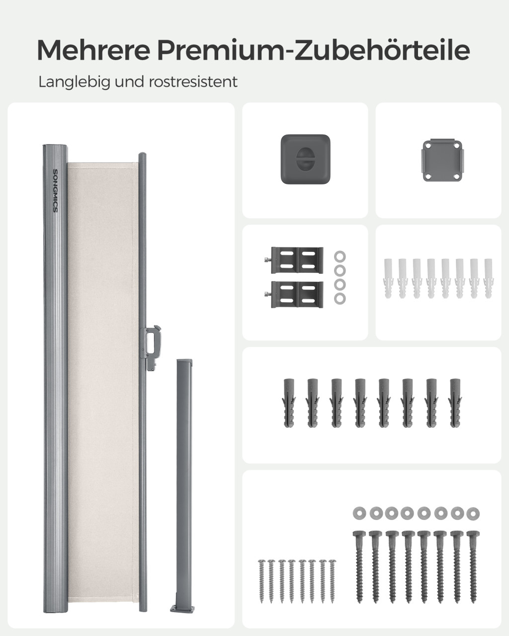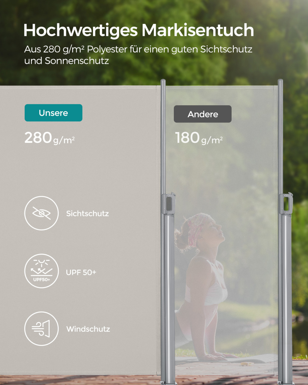 Ez a kiváló minőségű oldalsó napellenző ideális megoldást kínál a terasz, erkély vagy kert napfény és szél elleni védelmére. Az időjárásálló alumínium szerkezet és a 280 g/m² sűrűségű poliészter vászon hosszú élettartamot garantál.