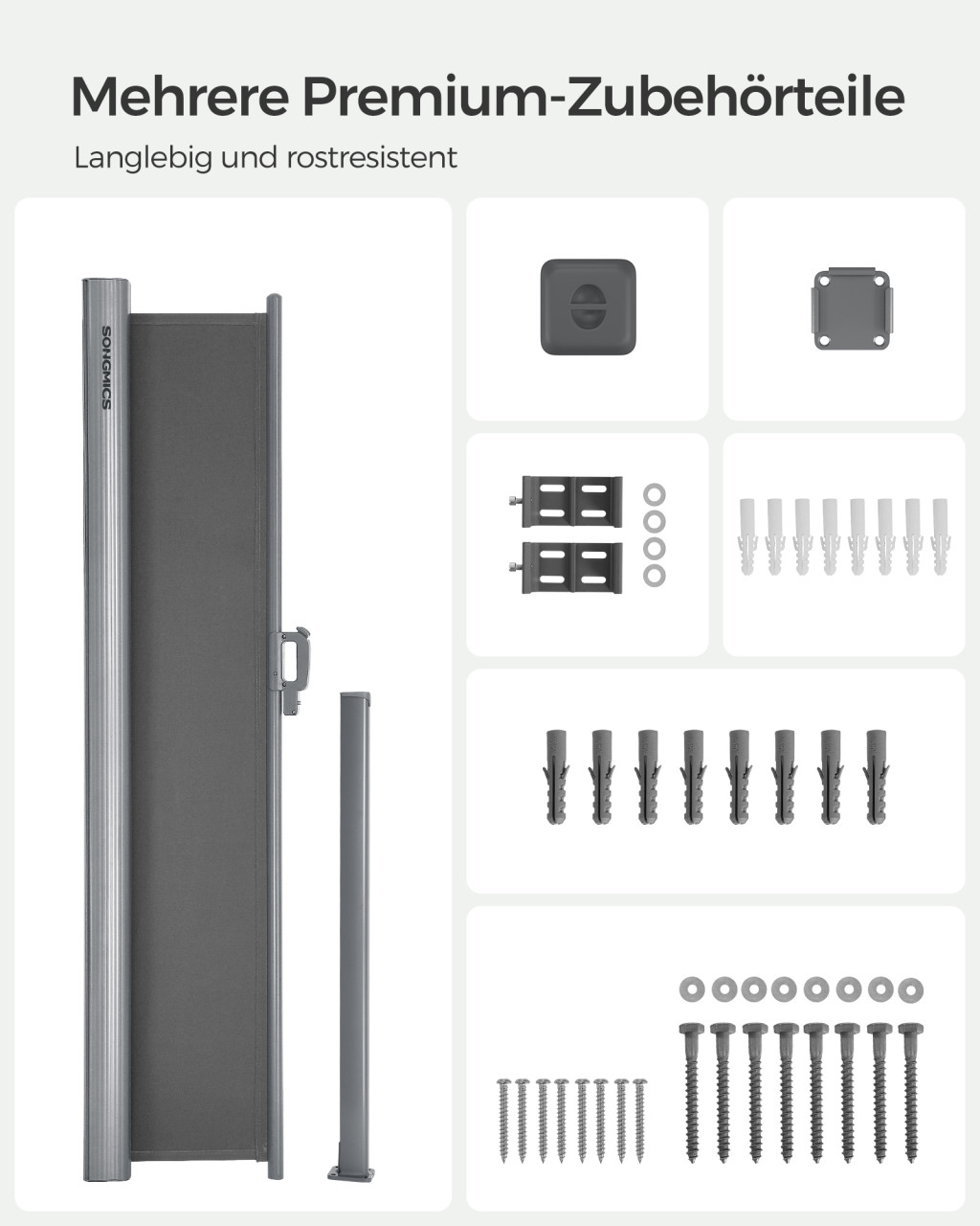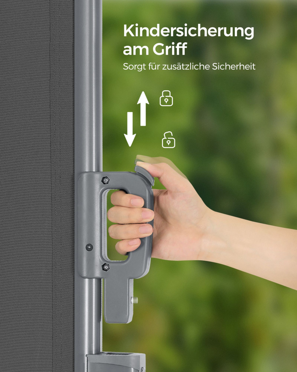 Ez a prémium minőségű oldalsó napellenző ideális megoldást nyújt a terasz vagy kert árnyékolására és a magánszféra védelmére. Az időjárásálló alumínium szerkezet és a 280 g/m² sűrűségű, PU bevonatú poliészter ponyva hosszú élettartamot garantál.