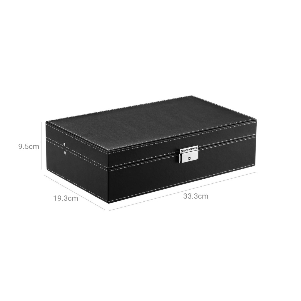 Ez a kifinomult SONGMICS óra- és ékszertartó doboz tökéletes megoldást nyújt értékes kiegészítőinek biztonságos és stílusos tárolására. A fekete műbőr külső és a szürke bársony belső nem csak elegáns megjelenést kölcsönöz, de védelmet is nyújt a karcolódások ellen. A beépített tükör és a praktikus rekeszek minden igényt kielégítenek.
